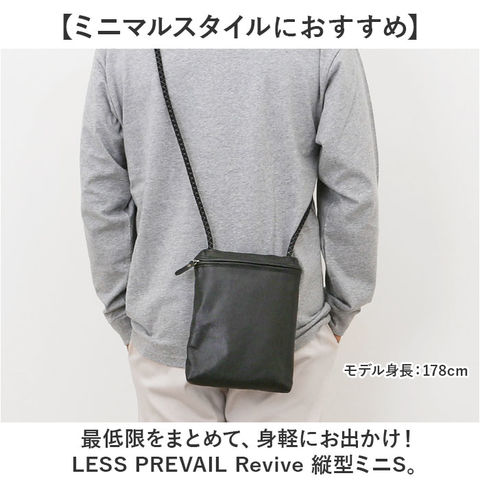 | 商品説明 | 【ミニマルスタイルにおすすめ】最低限をまとめて、身軽にお出かけ!LESS PREVAIL Revive 縦型ミニS。【風合いを楽しめるリバイブレザー】サステナブルなリバイブレザー(牛革)を採用。経年変化を楽しめて、使うほどに愛着もアップ。(※1)デットストックレザーに特殊な加工を施し、革本来の質感を損なうことなく再生しております。【気取らずおしゃれに持てるバッグ】レザーの素材感を活かしたデザインに、スポーティーなショルダーコードがアクセント。【両手が空いてストレスフリー】ショルダーコードを使って、肩掛けや斜め掛け。両手を自由に使えて移動もラクラク。(※2)結び目を変えて、長さ調節可能です。【開閉スムーズ、安心のファスナー式】大きく開いて取り出しやすく、ファスナーを閉じれば中身のこぼれ落ちもガード。【メインもサブ使いもお任せ】マストアイテムを入れて、スマートに持てる縦型ショルダー。旅行などではサブバッグとしても。【サクッと取り出せて迷子知らず】内側にポケットを1つ配置。細々した物も、バッグの中で探す手間が不要。【引っ張って使えるキーリング】ショルダーコード内側にキーリングを。引っ張るとベルトがスライド、そのまま鍵の開閉が可能。【無駄のないシンプルな仕上がり】開口部を閉じると、引き手が背面に隠れる仕様。フロントから金具が見えず、スタイリッシュ。【どなたが持ってもサマになる☆】コーデに馴染むユニセックス仕様。長く愛用できるこだわりのアイテムは、贈り物にもおすすめ。【ポケット仕様】内側:オープンポケット×1 |