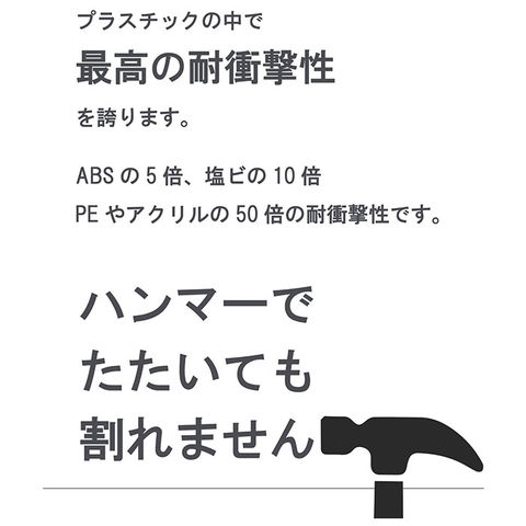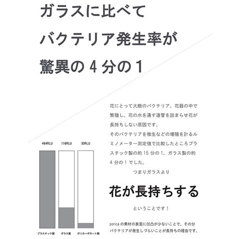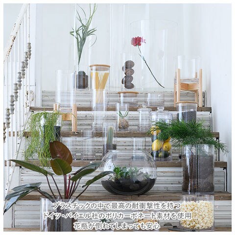 | 商品説明 | ガラスのような透明感に、驚きの耐衝撃性をプラス!割れない花瓶「PVシリンダー12 H50タイプ」が新登場。プラスチックの中で最高の耐衝撃性を持つドイツ・バイエル社のポリカーボネート素材を使用。美しさと耐久性を兼ね備えた、シンプルなシリンダー型のフラワーベース。ABS樹脂の5倍、ポリ塩化ビニルの10倍、PEやアクリルの50倍。ハンマーで叩いても壊れないほどの耐衝撃性を誇り、花瓶が倒れてしまっても安心。スタイリッシュな見た目と透明度はまるでガラスそのもの。可視光線透過率約80%~90%の高い透明感で、奥行きのある空間を演出。花器内部のバクテリア繁殖率はガラスの約1/4以下のため、お花のみずみずしさが長持ち。ガラス製品では難しかった、電動ドリルでの穴あけ加工が可能なので、紐で吊り下げたり、複数開けた穴に様々角度から花を生けたりなど、アレンジも自在。ドウダンツツジやミモザのような、背の高い枝もののグリーンも花器の転倒を気にせず生けられる超ビッグサイズ。店舗ディスプレイやパーティー会場のフラワーオブジェにも最適。 |