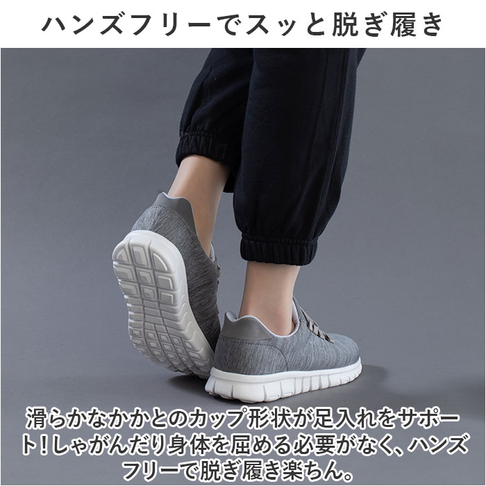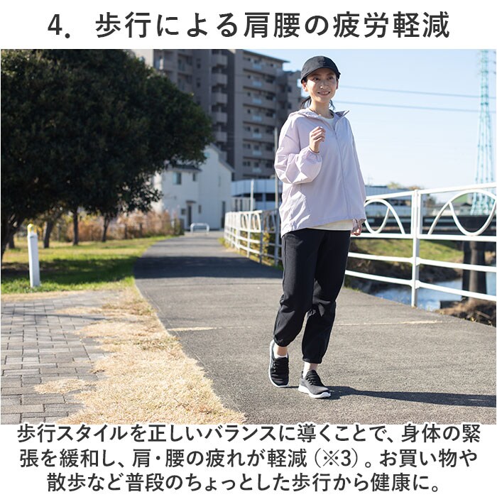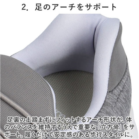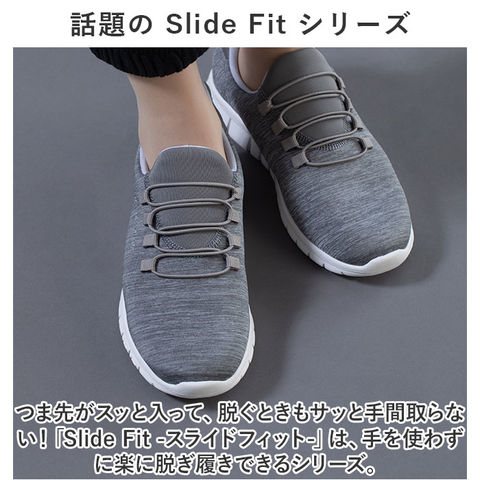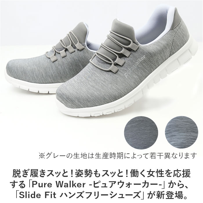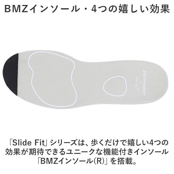 商品説明脱ぎ履きスッと!姿勢もスッと!働く女性を応援する「Pure Walker -ピュアウォーカー-」から、「Slide Fit ハンズフリーシューズ」が新登場。【話題の Slide Fit シリーズ】つま先がスッと入って、脱ぐときもサッと手間取らない!「Slide Fit -スライドフィット-」は、手を使わずに楽に脱ぎ履きできるシリーズ。【ハンズフリーでスッと脱ぎ履き】滑らかなかかとのカップ形状が足入れをサポート!しゃがんだり身体を屈める必要がなく、ハンズフリーで脱ぎ履き楽ちん。【ふわっと軽い履き心地】シューズ片足分の重量はわずか約180g。履いていることを忘れてしまうほどの軽い履き心地で、軽快なフットワークを実現(※1)。(※23.5cmサイズの商品、付属のインソールの重量を含む、片足分の計測重量です。)【BMZインソール・4つの嬉しい効果】・「Slide Fit」シリーズは、歩くだけで嬉しい4つの効果が期待できるユニークな機能付きインソール「BMZインソール(R)」を搭載。【1.歩きながらエクササイズ】足指の付け根部分に適度なふくらみを持たせたインソール構造により、足指が自由に動き、足の運動効果がアップ!歩きながら、美しい脚のラインにエクササイズ。(※2)【2.足のアーチをサポート】足裏の土踏まずにフィットするアーチ形状が、体のバランスを維持するうえで重要な「立方骨」をサポート。履くだけで安定感のある歩行スタイルに。【3.キレイな姿勢をキープ】足裏のアーチをしっかりつくることで身体のバランスを整え、キレイな姿勢もキープ。シューズを履いて歩けば、背筋も自然にスッと伸びる!【4.歩行による肩腰の疲労軽減】今までの歩行スタイルを正しいバランスに導くことで、身体の緊張を緩和し、肩・腰の疲れが軽減(※3)。お買い物や散歩など普段のちょっとした歩行から健康に。【紐がほどけない、ゴム紐タイプ】足の甲に優しくフィットするゴム紐タイプだから、くつ紐がほどける心配がなく、結びなおす手間もないのが嬉しいポイント。