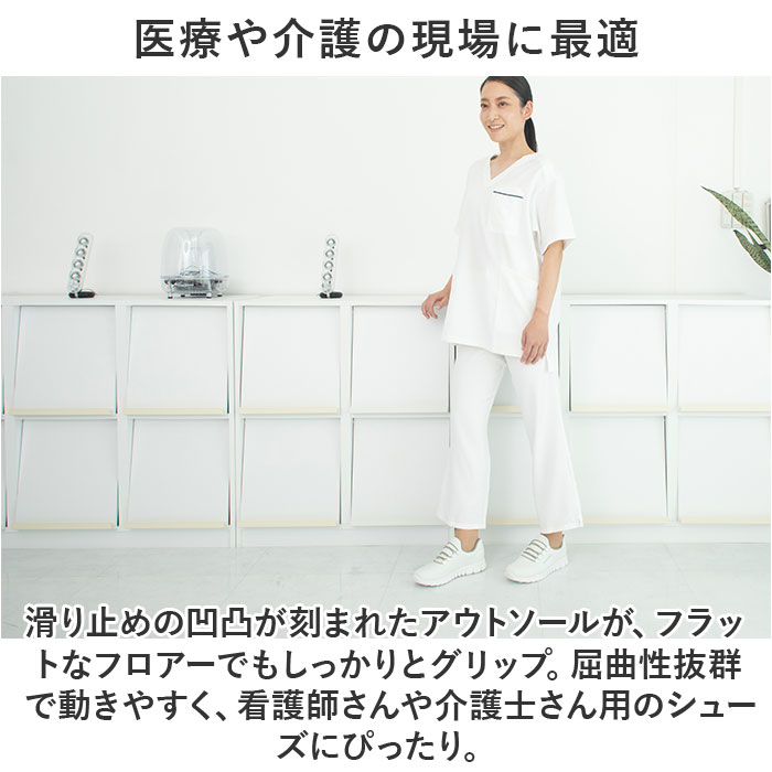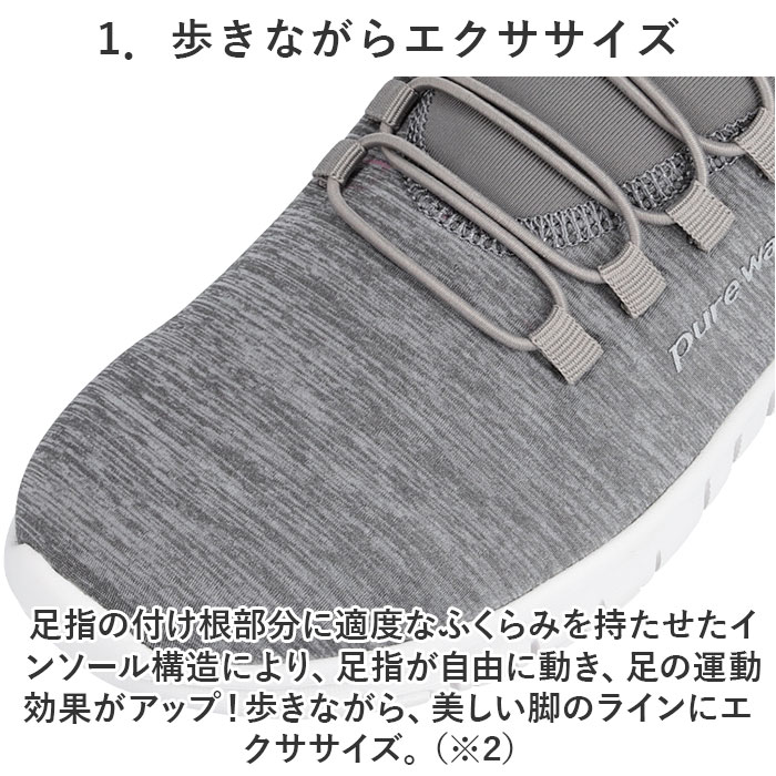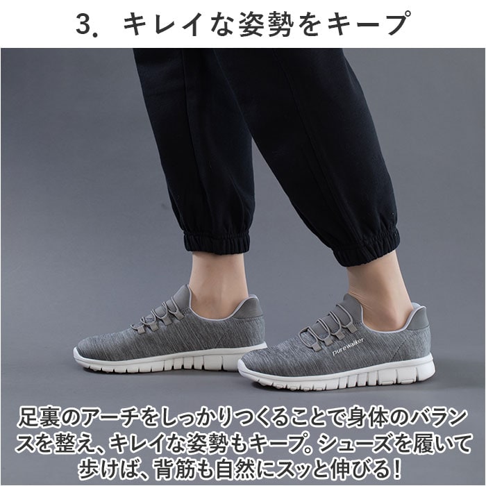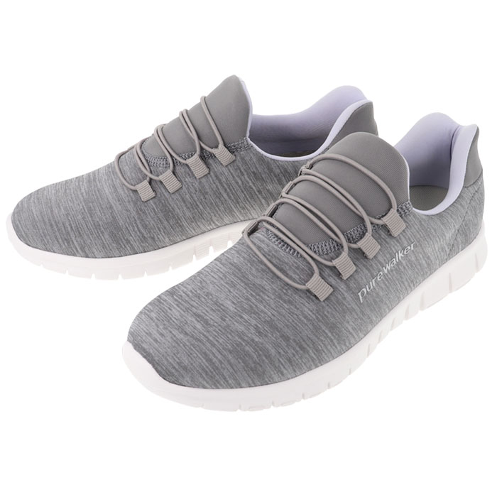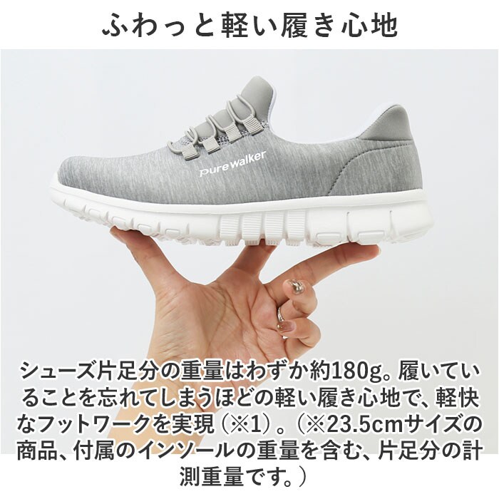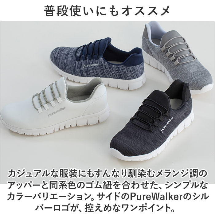 注意点【医療や介護の現場に最適】滑り止めの凹凸が刻まれたアウトソールが、フラットなフロアーでもしっかりとグリップ。屈曲性抜群で動きやすく、看護師さんや介護士さん用のシューズにぴったり。【普段使いにもオススメ】カジュアルな服装にもすんなり馴染むメランジ調のアッパーと同系色のゴム紐を合わせた、シンプルなカラーバリエーション。サイドのPureWalkerのシルバーロゴが、控えめなワンポイント。※1.シューズ片足分の重量はわずか約180g。履いていることを忘れてしまうほどの軽い履き心地で、軽快なフットワークを実現。・・・(※23.5cmサイズの商品、付属のインソールの重量を含む、片足分の計測重量です。)※2.美しい脚のラインにエクササイズ。・・・※脚痩せという点で、効果が期待できます。※3.身体の緊張を緩和し、肩・腰の疲れが軽減。・・・※肩・腰のコリ、緊張度の緩和に有用。長時間日光にあたったり、摩擦、水漏れなどによる色落ちや色移りすることがあります。お取り扱いの際は、商品やパッケージなどに記載されている品質表示、アテンションタグ、ご使用上の注意事項などを必ずご確認下さい。本来の目的以外にはご使用にならないで下さい。カメラやモニターの性質により、画像と実物の色の違いがある場合がございますのでご理解願います。