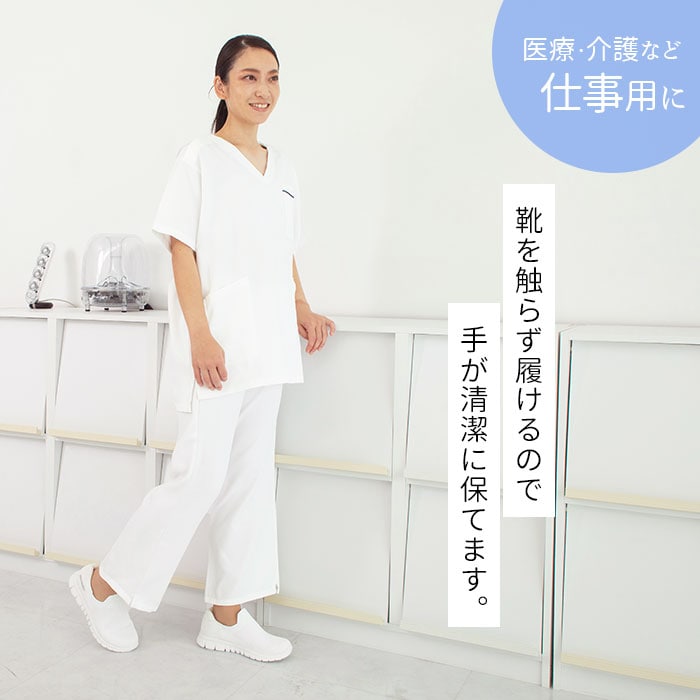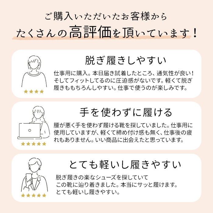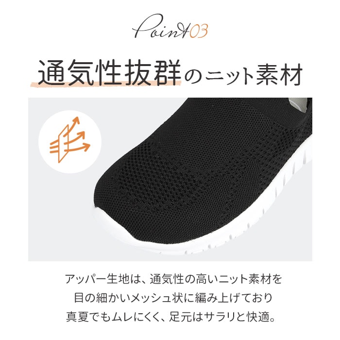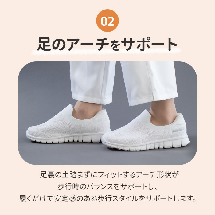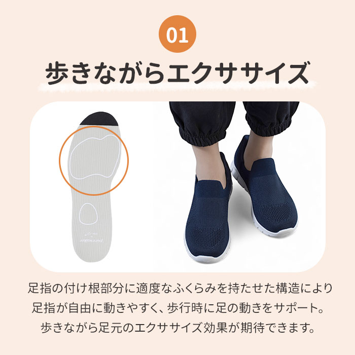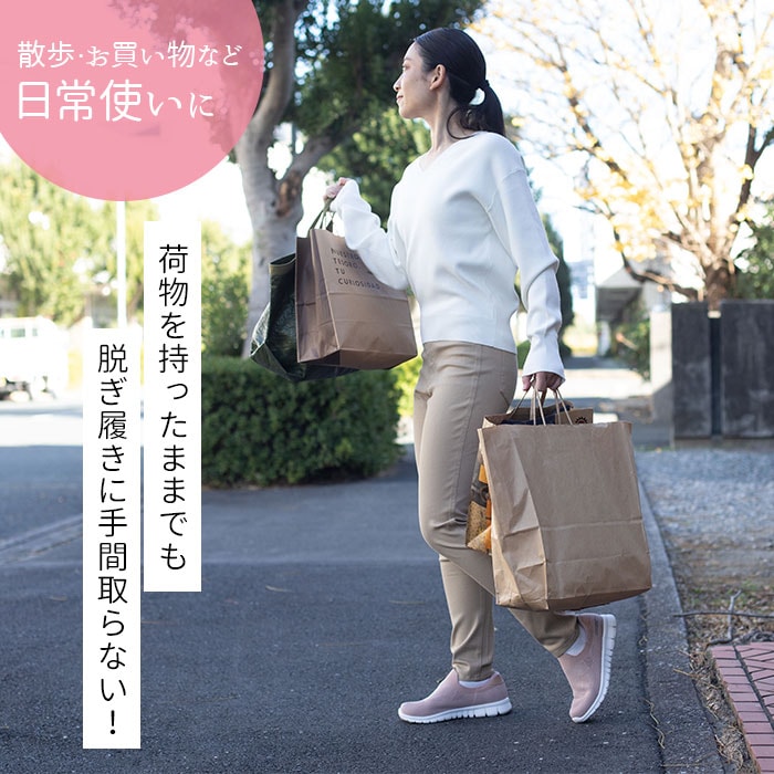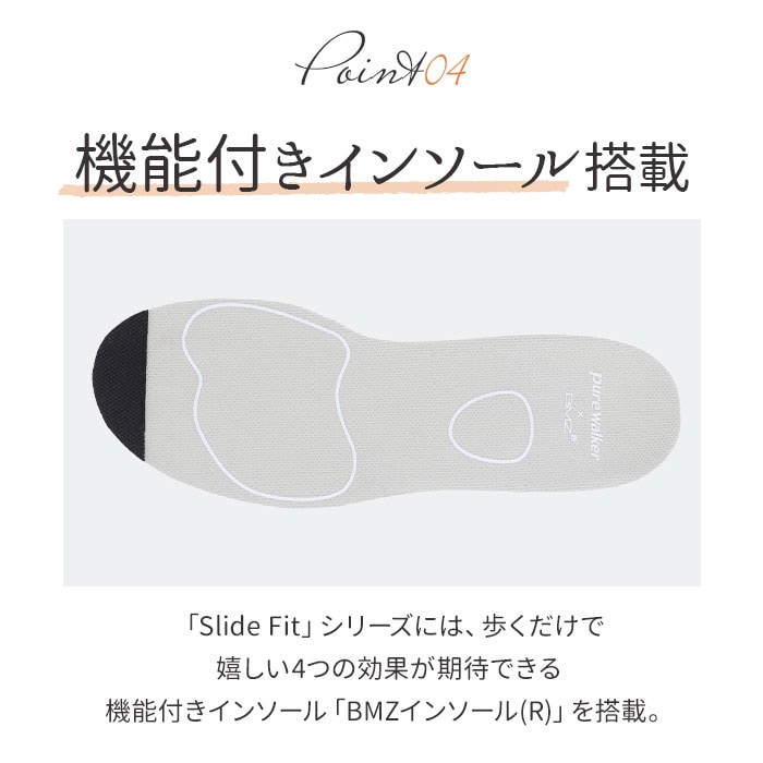 | 商品説明 | 脱ぎ履きスッと!姿勢もスッと!働く女性を応援する「Pure Walker -ピュアウォーカー-」から、「Slide Fit ハンズフリーシューズ」が新登場。【話題の Slide Fit シリーズ】つま先がスッと入って、脱ぐときもサッと手間取らない!「Slide Fit -スライドフィット-」は、手を使わずに楽に脱ぎ履きできるシリーズ。【ハンズフリーでスッと脱ぎ履き】滑らかなかかとのカップ形状が足入れをサポート!しゃがんだり身体を屈める必要がなく、ハンズフリーで脱ぎ履き楽ちん。【通気性抜群のニット素材】アッパー生地は、通気性の高いニット素材を目の細かいメッシュ状に編み上げ、真夏でも足元はサラリと快適。【ふわっと軽い履き心地】シューズ片足分の重量はわずか約180g。履いていることを忘れてしまうほどの軽い履き心地で、軽快なフットワークを実現(※1)。【BMZインソール・4つの嬉しい効果】・「Slide Fit」シリーズは、歩くだけで嬉しい4つの効果が期待できるユニークな機能付きインソール「BMZインソール(R)」を搭載。【1.歩きながらエクササイズ】足指の付け根部分に適度なふくらみを持たせたインソール構造により、足指が自由に動き、足の運動効果がアップ!歩きながら、美しい脚のラインにエクササイズ。(※2)【2.足のアーチをサポート】足裏の土踏まずにフィットするアーチ形状が、体のバランスを維持するうえで重要な「立方骨」をサポート。履くだけで安定感のある歩行スタイルに。【3.キレイな姿勢をキープ】足裏のアーチをしっかりつくることで身体のバランスを整え、キレイな姿勢もキープ。シューズを履いて歩けば、背筋も自然にスッと伸びる!【4.歩行による肩腰の疲労軽減】今までの歩行スタイルを正しいバランスに導くことで、身体の緊張を緩和し、肩・腰の疲れが軽減(※3)。お買い物や散歩など普段のちょっとした歩行から健康に。【楽ラク!スリッポンスタイル】くつ紐を結ぶ手間がなく、足を滑り込ませるだけで履けるラクラクスリッポンスタイル。 |