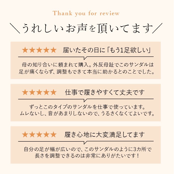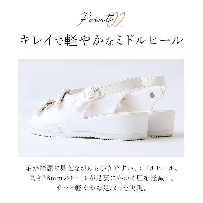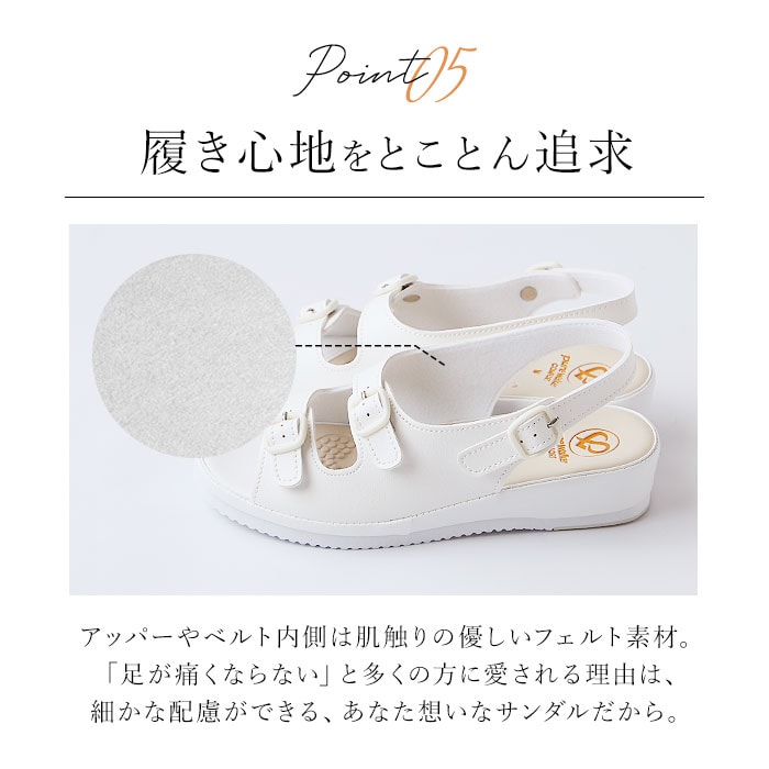 | 商品説明 | 足裏を支えて、ゆったりホールド。「Pure Walker -ピュアウォーカー-」から、働く女性を応援する「コンフォート・ナースサンダル」が新登場。【こんな方にオススメ!】足が幅広で悩んでいる方、外反母趾や偏平足でお悩みの方に最適!幅調整の可能なコンフォートサンダル。【ゆったり幅広設計】ゆったり幅広設計だから、足当たりがとってもソフト。幅広足が気になる方でもつま先が痛くならない優しいつくり。【調節できて、ぴったりフィット】足の甲部分のベルトストラップは5段階に調節可能。足の形や甲の高さに合わせてびったりフィット!【快適クッションインソール】ふんわり柔らかな立体フットベッドが足裏にかかる衝撃を優しく吸収。ゴム質スポンジのクッションインソールで快適な履き心地。【医療や介護の現場に最適】滑り止めの凹凸が刻まれたアウトソールが、フラットなフロアーでもしっかりとグリップ。ナースシューズや介護士さんにも最適。【歩きやすいミドルヒール】アッパーやベルト内側は肌触りの優しいフェルト素材。さらに、高さ38mmのミドルヒールが足裏にかかる圧を軽減し、サッと軽やかな足取りを実現。【足ツボ効果にも期待♪】インソール表面のつぶつぶの突起が、足裏を心地よく刺激!シューズの中の足の前滑りを防いで、足ツボ効果にも期待♪【働く女性をサポート】長時間のお仕事でも足が疲れにくく、働く女性の足を優しくサポート。医療の現場だけでなく、オフィス用サンダルとしても大活躍! |