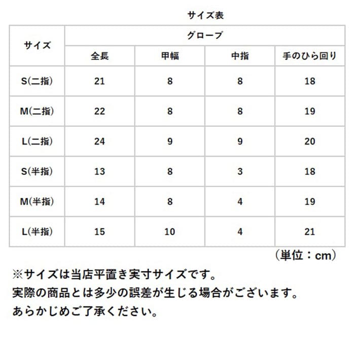 | サイズ | [二指・半指] ・Sサイズ ・Mサイズ ・Lサイズ ※サイズについて詳細は、商品画像の中にあるサイズ表をご覧くださいませ。 |