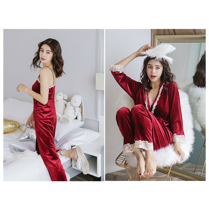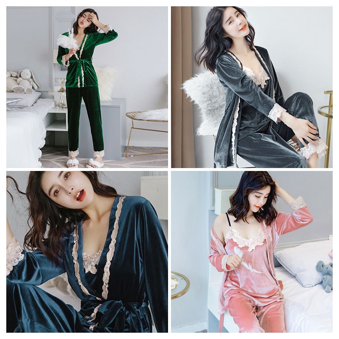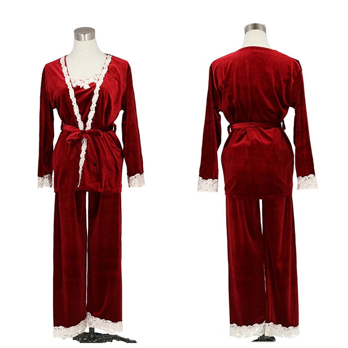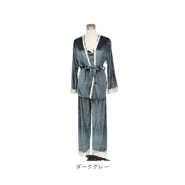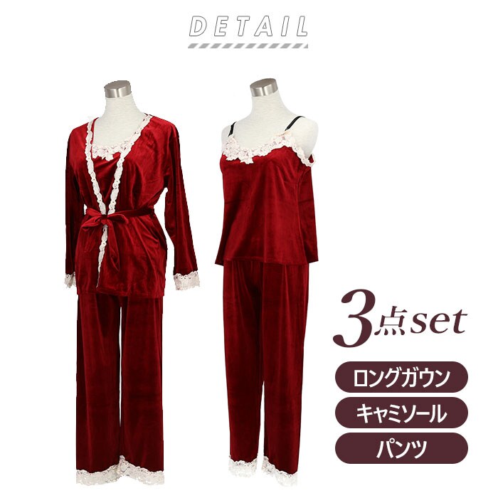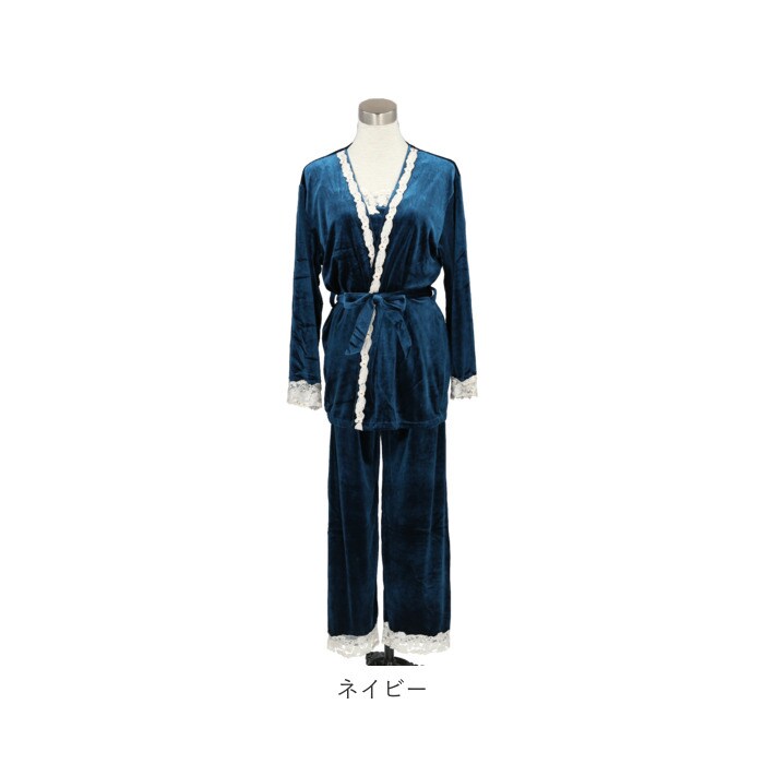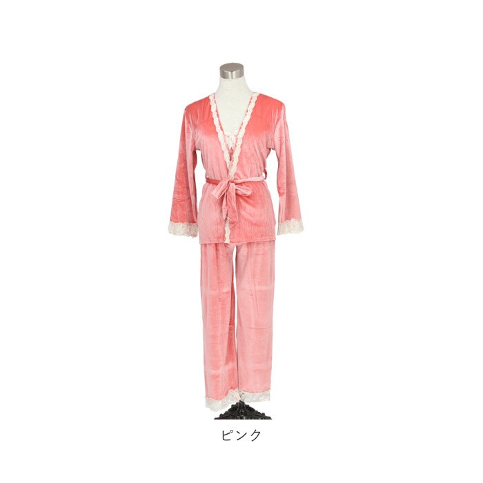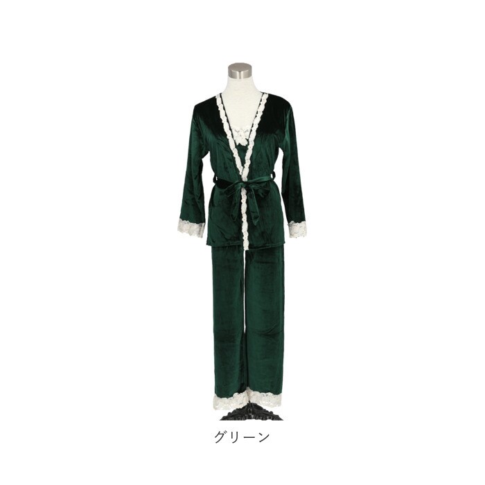 | 商品説明 | おうちでのリラックスタイムが、もっと自分らしく華やかに。ベルベット素材のルームウェア3点セット。キャミソールとパンツの上下セットアップに、ロングガウンをプラス。ゆったりと身に纏えてリラックスできるのに、自分らしいお洒落スタイルしっかりキープ!トップスはデコルテラインをすっきり眩しく見せる、キャミソールスタイル。肩紐はアジャスター付きで自分にあったサイズに調節可能。スッキリしたラインのパンツは、ウエストが締め付け感のないゴムタイプなので着心地も快適。サッと羽織れるロングガウンがあれば、少し肌寒く感じる季節やクーラーが効いた室内でも安心。突然の来客など、キャミソールだけでは肌の露出が気になる場合にもちょうどいい。キャミソールの胸元やパンツの裾に配されたレースが可愛い♪柔らかな肌触りのベルベット素材を使用。巣ごもりタイムをゴージャスに彩る♪ |