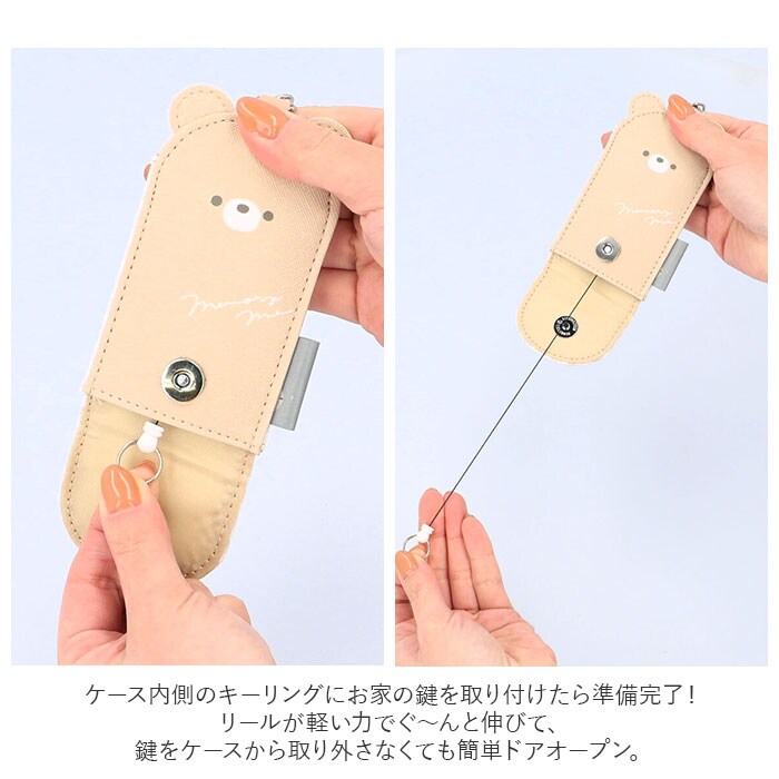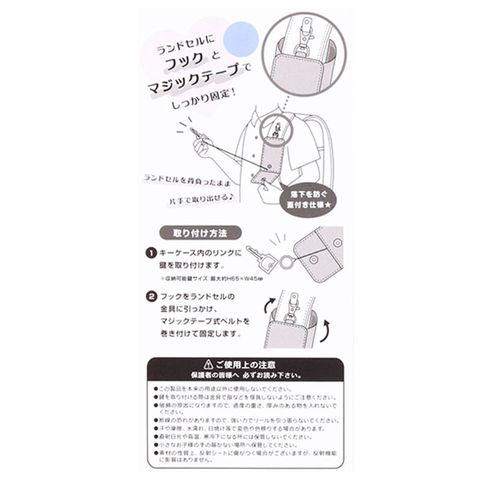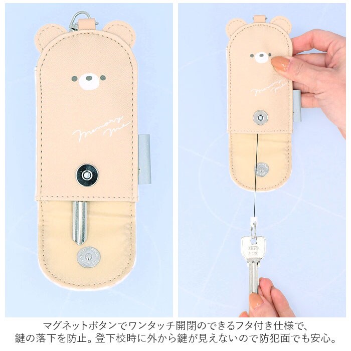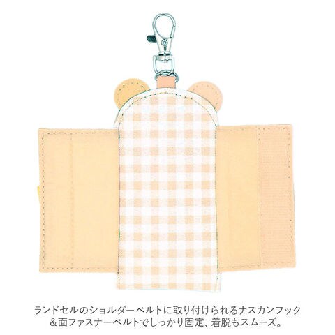 | 商品説明 | 鍵の紛失や防犯対策に!アニマルデザインが可愛い「キッズ用・ダイカットキーケース」ランドセルのショルダーベルトに取り付けられるナスカンフック&面ファスナーベルトでしっかり固定、着脱もスムーズ。ケース内側のキーリングにお家の鍵を取り付けたら準備完了!約40cmのリールが軽い力でぐ~んと伸びて、鍵をケースから取り外さなくても簡単ドアオープン。マグネットボタンでワンタッチ開閉のできるフタ付き仕様で、鍵の落下を防止。登下校時に外から鍵が見えないので防犯面でも安心。薄暗い夕方の下校時間や夜道でも、ピカッと光って安心☆自動車のライトを反射するリフレクタータグ付き。ケースの生地は、雨の水滴を弾いて、汚れもサッと拭き取れるPVCフェイクレザー素材を採用。ぴょこんと飛び出たお耳が可愛い、アニマルフェイスのダイカットデザイン!お気に入りのコを選んでね♪ |