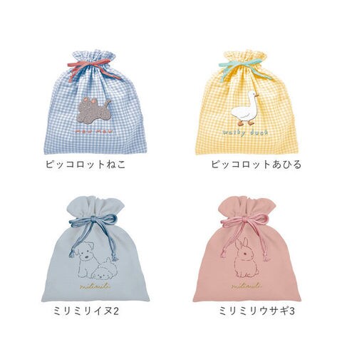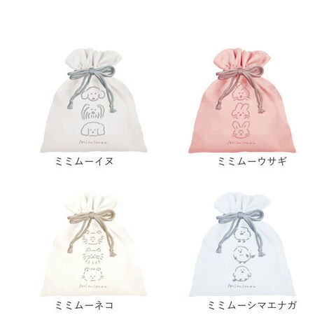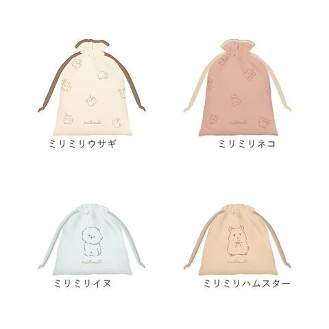 | 素材 | [ゆるすいみー、ミリミリ(イヌ2、ウサギ3、ネコ2、シマエナガ3)] リネン、ポリエステル [ミリミリ(シマエナガ、クマ、ウサギ、ネコ)] コットン、PU合皮、ポリエステル [ミリミリ(ウサギ2、シマエナガ2、イヌ、ハムスター)、ピッコロット] コットン |