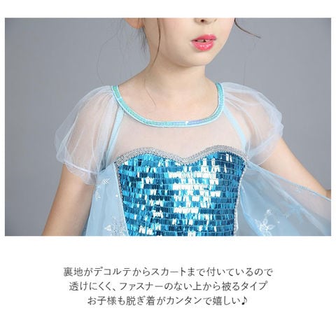 | 商品説明 | 脇の下から流れるようなシルエットのマントがふわり♪とってもゴージャスでエレガントなプリンセス”映え”間違いなし!雪の結晶がプリントされたマントはドレープたっぷりでスカートより若干長め。両手でふわりと広げれば雪の女王に早変わり★スカート部分は裏地とチュールの間に濃い色のオーガンジー生地が挟んであるので、淡くなりすぎず引き締まった印象に。裏地がデコルテからスカートまで付いているので透けにくく、ファスナーのない上から被るタイプのドレスだから、お子様も脱ぎ着がカンタンで嬉しい♪正面からはもちろん、後ろから見ても優雅で上品な愛されシルエットは、まさに女の子の憧れ!記念日に、お呼ばれに、コスプレパーティーに、色んなシーンでみんなの視線を釘付け! |