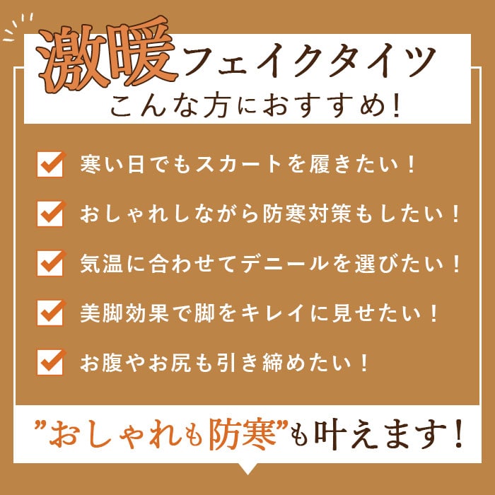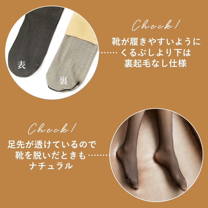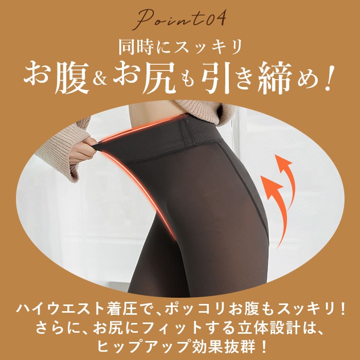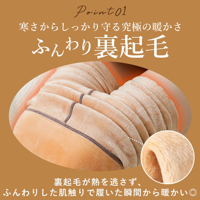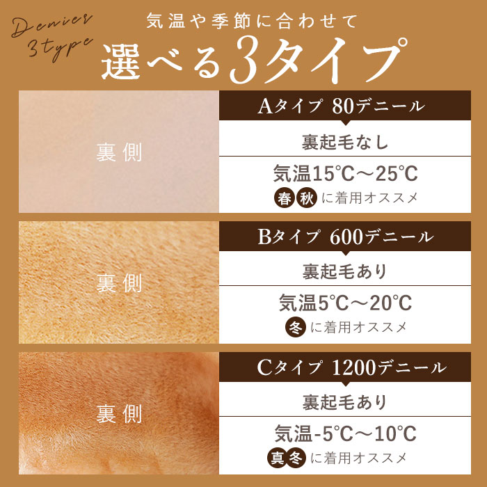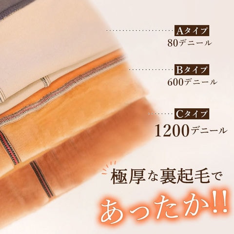| 商品説明 | 寒い日は足元からぬくぬくと♪しっかり防寒してくれる、裏起毛タイツ。季節に合わせて選べる3タイプのデニールで、寒さ対策もバッチリ!春秋にオススメ。80デニールのAタイプは裏起毛のない、すっきりした履き心地。冬の寒い日にオススメ。裏起毛付き600デニールのBタイプ。屋外で過ごす寒い日にオススメ、厚手裏起毛付き1200デニールのCタイプ。B、Cタイプの裏起毛は熱を逃さず、ふんわりした肌触りで温かさをキープ!くるぶしより下は裏起毛なし、パンプスなどの着用もOK!肉厚生地なのに、ストッキングの様な見た目。毎日のコーディネートに大活躍!全タイプ共通、ハイウエストの着圧仕様で、おなかもぴったりあたたかく。さらに、おしりにフィットする立体設計はヒップアップの期待大♪肌見せ風の特殊加工を施し、着用すると自然な透け感を演出してくれるのが嬉しいポイント。 |