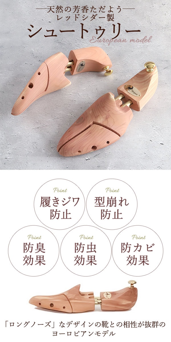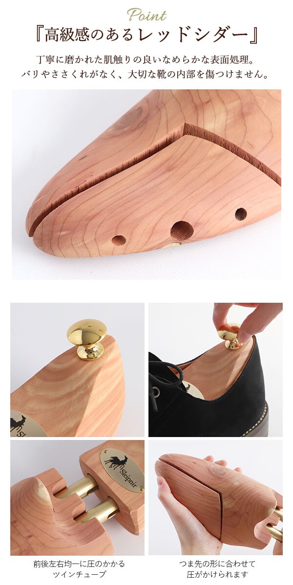 | 注意点 | 1.靴のサイズに合ったシュートゥリーをご使用下さい。靴よりも著しく大きなシュートゥリーをご使用になると靴に必要以上の負荷がかかってしまいます。 2.本品表面に白い粉状のものが見られる場合がありますが、防虫効果のある芳香成分の天然シダーオイルが結晶化したもので使用には問題ありません。布やティッシュなどで拭きとってご使用いただけます。 3.天然の木材を使用しているため、乾燥などによりまれにヒビや割れが起こる場合がございます |