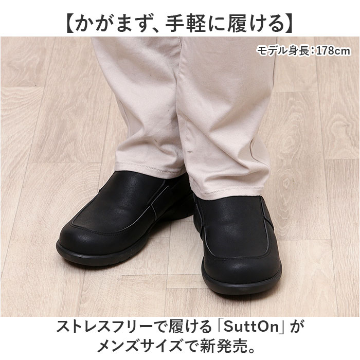 | 商品説明 | 【かがまず、手軽に履ける】ストレスフリー履ける「SuttOn」がメンズサイズで新発売。【欲しかったのは、この手軽さ!】急いでいる時も手がふさがっている時も、サッと足を入れるだけで“秒”で出発可能!【メッシュ素材で足入れスムーズ】かかと部分はメッシュ素材で足入れがスムーズ。丈夫な造りで、キレイな形を保てたまま履ける【ラウンドトゥでつま先ゆったり】丸いつま先形状がちょうどいいゆったり感。締め付け感がなく、足がくつろぐ履き心地。【ストレスフリーに履ける】シュータン部分に柔らかく伸縮するサイドゴアを内蔵。つま先がスッと入ってストレスフリー。【インソールも歩きやすい工夫を】独自のアーチ形状でフィット感UP!集中する負荷を分散するクッション入り。【嬉しい抗菌・消臭】インソールの表面は抗菌・消臭素材で出来ており、いつでも清潔に使える◎【雨の日のしっかりグリップ】EVA素材のアウトソールには凹凸を刻み込み、雨の日もしっかり地面をグリップ。【シニアの方や子育てパパにも】屈んで靴を履くことが難しいシニアの方、お子様を抱っこしてのお出掛けにぴったり【どんなシーンにも合う合皮】ワンカラーの合皮素材を使用し、普段のお出かけはもちろん、オフィス用にもオススメ♪ |
