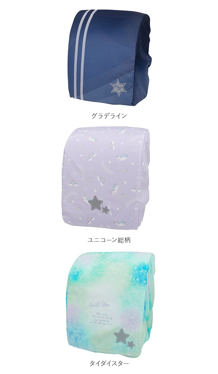 | 注意点 | 横型ランドセルや特殊な形状のランドセルには装着できません。本製品は縫製品につき完全防水ではありません。使用状況により縫い目から水が染み込むことがあります。炎天下や雨ざらし等で長時間放置しないでください。紫外線や酸性雨などの自然現象で耐久性が損なわれます。火気や高温になるものを近づけないでください。引火したり、溶けることがあります。自然光及び照明などにより、通常のご使用でも若干の変色・退色は避けられませんので、ご了承ください。生地には、はっ水加工を施していますが、永久的なものではありません。ご使用を繰り返すうちにはっ水性が落ちてくることがあります。その際は市販の布製品用はっ水スプレーを表面から塗布していただくと長くお使いいただけます。お子様には保護者の方から十分ご注意ください。カメラやモニターの性質により、画像と実物の色の違いがある場合がございますのでご理解願います。 |