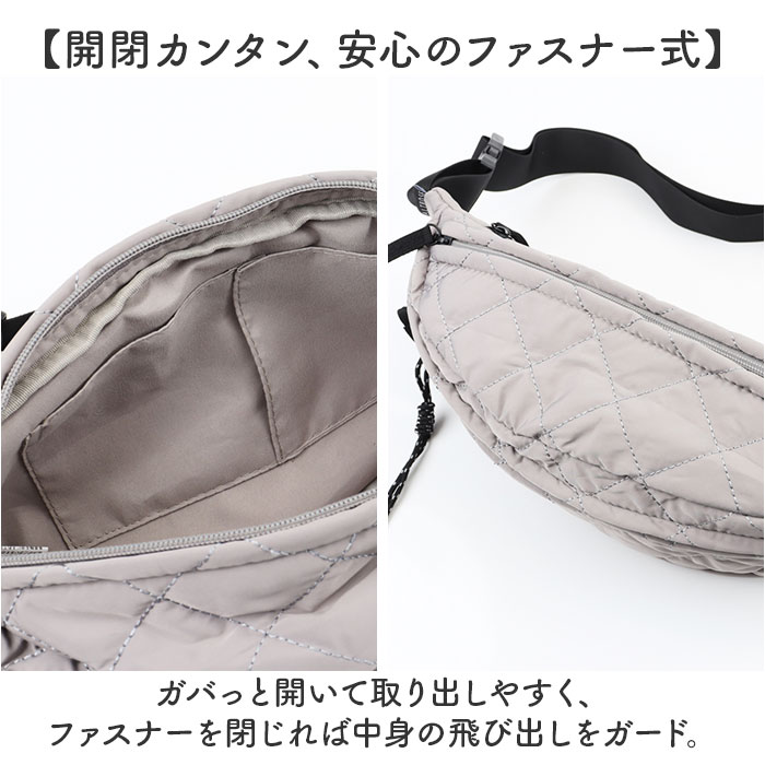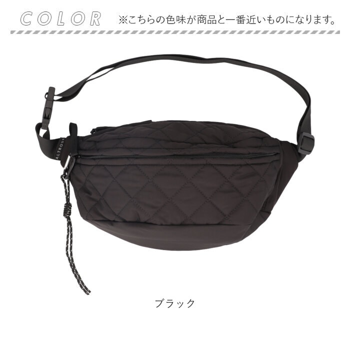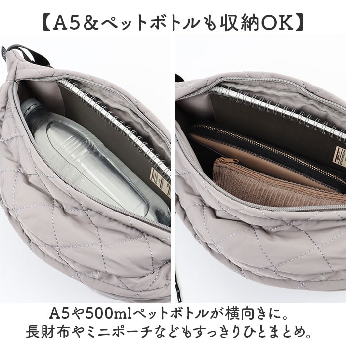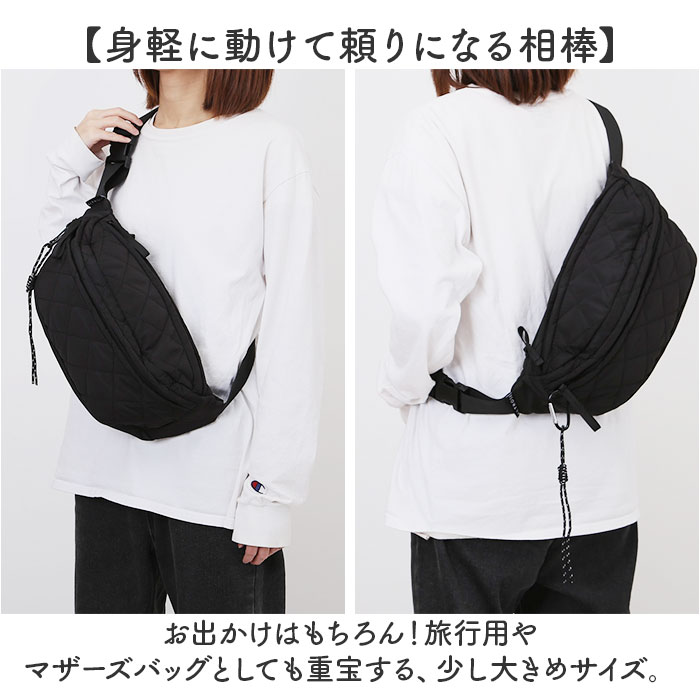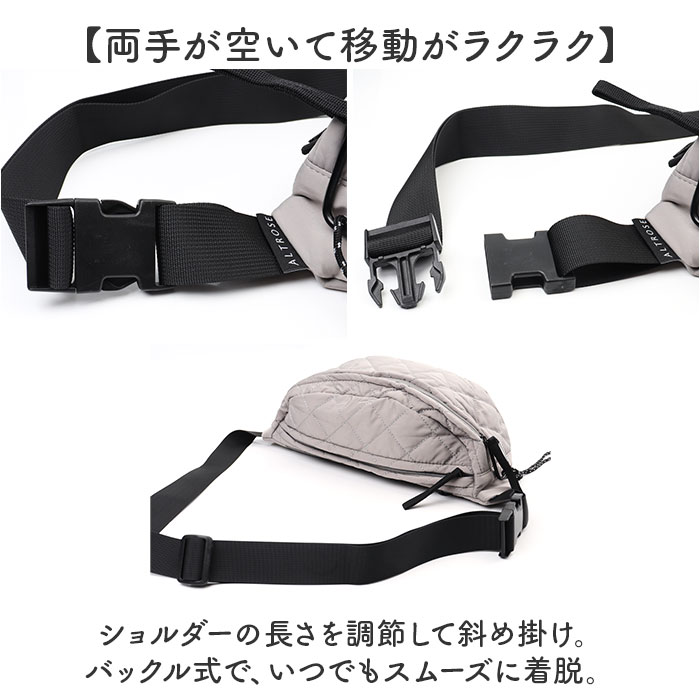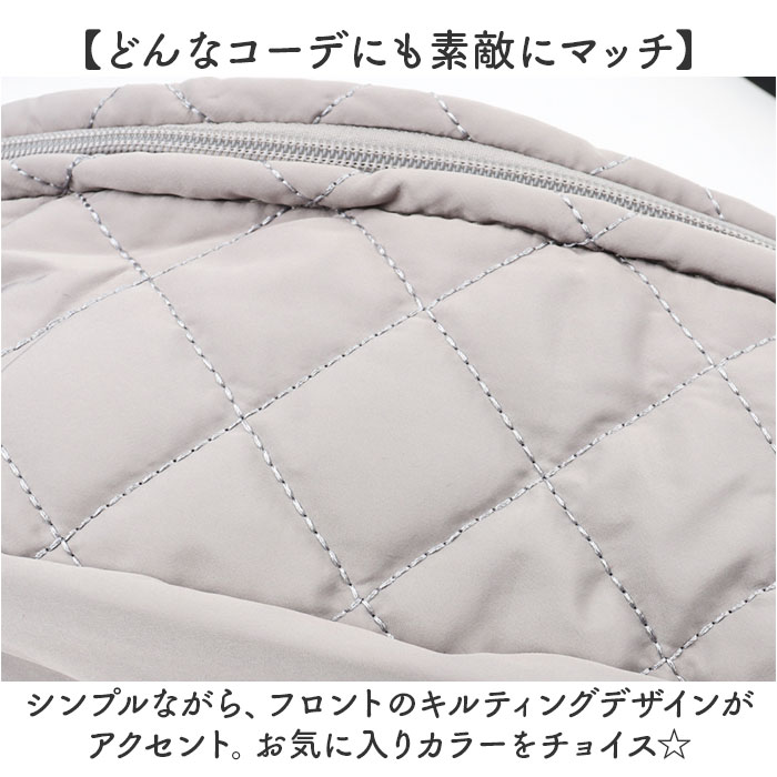 | 商品説明 | 【身軽に動けて頼りになる相棒】サッと持ち出せて使い勝手抜群◎カジュアルライクな仕上がりの「タムBODYBAG」。【色んなシーンで使えるサイズ感】お出かけはもちろん!旅行用やマザーズバッグとしても重宝する、少し大きめサイズ。【軽やかな使い心地でストレスフリー】サラッと軽いナイロン素材。丈夫でガシガシ使えて、体に負担をかけにくい&優しくフィット!(※)収納ルーム背面にクッション入りです。【両手が空いて移動がラクラク】ショルダーの長さを調節して斜め掛け。バックル式で、いつでもスムーズに着脱。【開閉カンタン、安心のファスナー式】ガバっと開いて取り出しやすく、ファスナーを閉じれば中身の飛び出しをガード。【A5&ペットボトルも収納OK】A5や500mlペットボトルが横向きに。長財布やミニポーチなどもすっきりひとまとめ。【サクッと取り出せて迷子知らず】内ポケットと、外側前後にもポケットを配置。鍵などを取り付けできるカラビナも装備◎【どんなコーデにも素敵にマッチ】シンプルながら、フロントのキルティングデザインがアクセント。お気に入りカラーをチョイス☆【ポケット仕様】内側:オープンポケット×2前面:ファスナーポケット×1(引き手にカラビナ付き)背面:ファスナーポケット×1 |