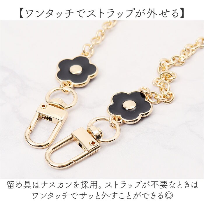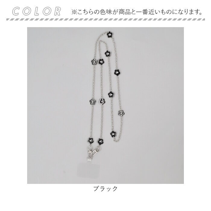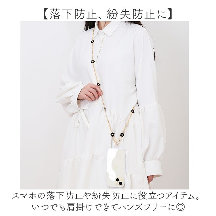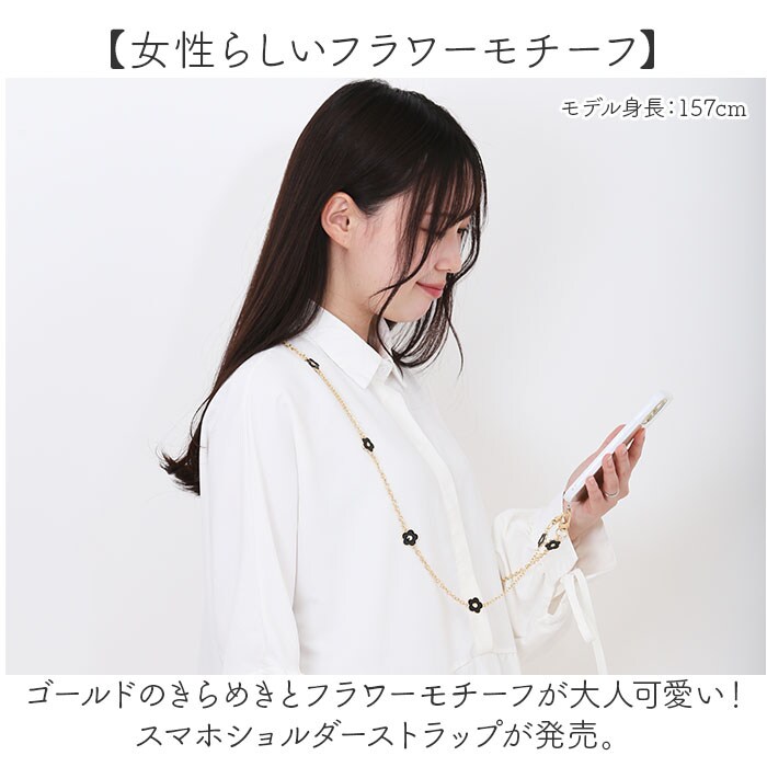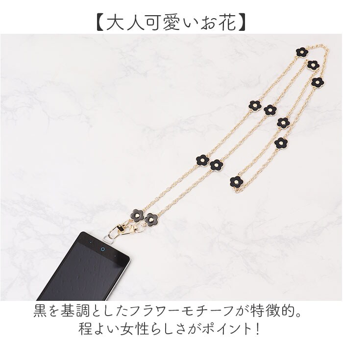 | 商品説明 | 【女性らしいフラワーモチーフ】ゴールドのきらめきとフラワーモチーフが大人可愛い!スマホショルダーストラップが発売。【大人可愛いお花】黒を基調としたフラワーモチーフが特徴的。程よい女性らしさがポイント!【キラッと輝くゴールドパーツ】チェーンや留め具はゴールドパーツを使用。アクセサリーのような煌きも嬉しい♪【簡単着脱!】スマホとスマホケースの間に付属のプレートを入れ、スマホ端末をセットすればOK!【落下防止、紛失防止に】スマホの落下防止や紛失防止に役立つアイテム。いつでも肩掛けできてハンズフリーに◎【ワンタッチでストラップが外せる】留め具はナスカンを採用。ストラップが不要なときはワンタッチでサッと外すことができる◎【注意点】※スマホケースの形状などにより、取り付けできない場合がございます。 |