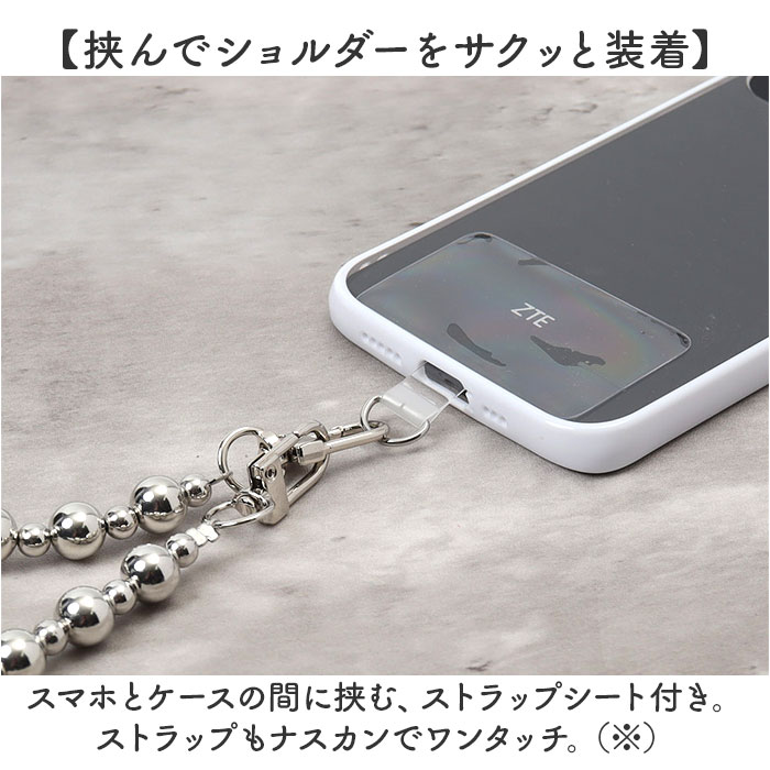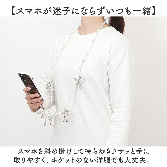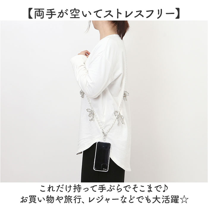 | 商品説明 | 【ケースに挟むだけのストラップ】お手持ちのスマホケースに簡単セット!コーデのアクセントにもなる「ビーズリボンストラップ」【スマホが迷子にならずいつも一緒】スマホを斜め掛けして持ち歩き♪サッと手に取りやすく、ポケットのない洋服でも大丈夫。【大人可愛いビーズリボンデザイン】まあるいビーズを繋げたストラップと、リボンモチーフ。キレイめコーデにもマッチ!【挟んでショルダーをサクッと装着】スマホとケースの間に挟む、ストラップシート付き。ストラップもナスカンでワンタッチ。(※)ケーブル穴の幅が1.3cm以上のケースにご使用いただけます。ケースの形状によっては使用できない場合もあります。【スマホの機種を問わず使える】お手持ちのスマホケースに取り付けるタイプなので、スマホを買い替えても使用可能。【両手が空いてストレスフリー】これだけ持って手ぶらでそこまで♪お買い物や旅行、レジャーなどでも大活躍☆ |