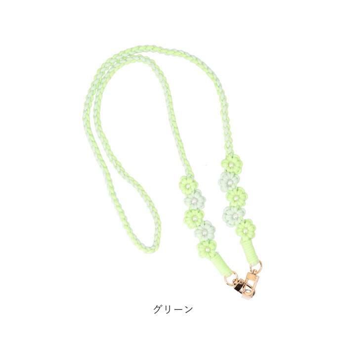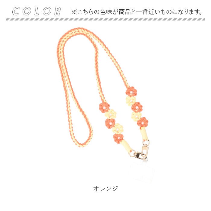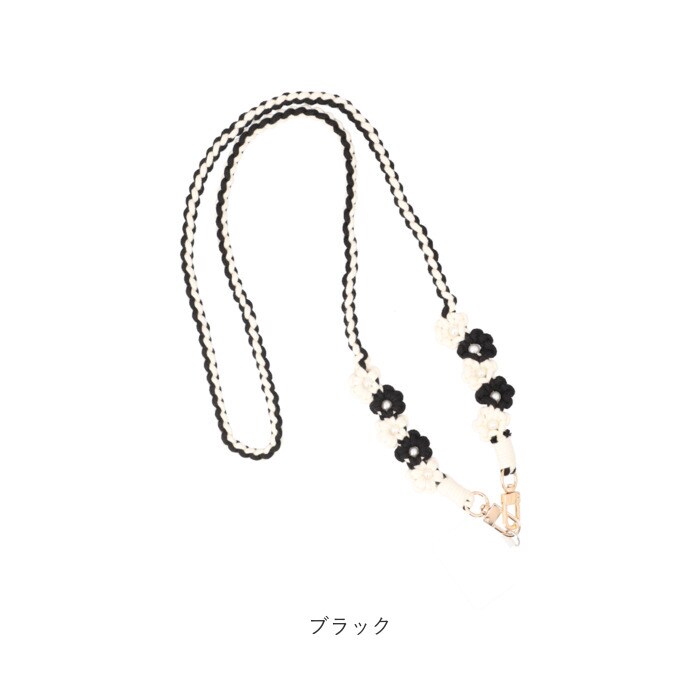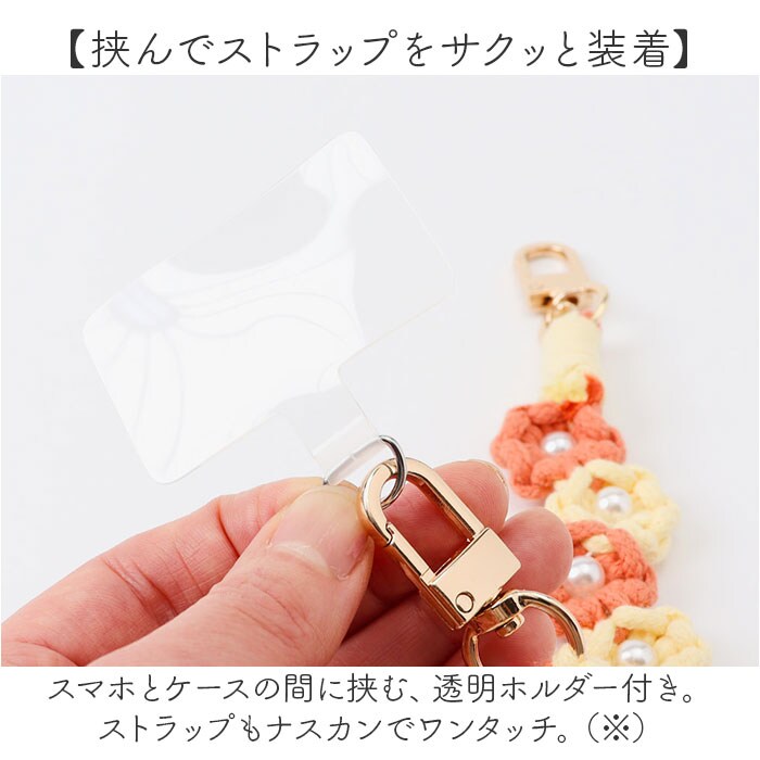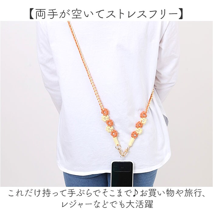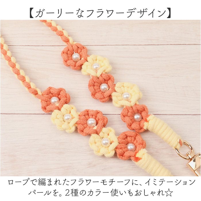 | 商品説明 | 【ケースに挟むだけのストラップ】お手持ちのスマホケースに簡単セット!コーデのポイントにもなるマクラメフラワーストラップ。【スマホが迷子にならずいつも一緒】スマホを斜め掛けして持ち歩き♪サッと手に取りやすく、ポケットのない洋服でも大丈夫。【ガーリーなフラワーデザイン】ロープで編まれたフラワーモチーフに、イミテーションパールを。2種のカラー使いもおしゃれ☆【挟んでストラップをサクッと装着】スマホとケースの間に挟む、透明ホルダー付き。ストラップもナスカンでワンタッチ。(※)ケースの形状や素材によっては使用できない場合もあります。【スマホの機種を問わず使える】お手持ちのスマホケースに取り付けるタイプなので、スマホを買い替えても使用可能。【両手が空いてストレスフリー】これだけ持って手ぶらでそこまで♪お買い物や旅行、レジャーなどでも大活躍☆ |
