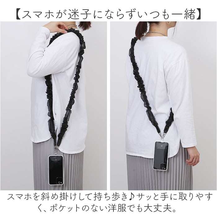 | 商品説明 | 【ケースに挟むだけのストラップ】お手持ちのスマホケースに簡単セット!「オーガンレイヤードストラップ」。【スマホが迷子にならずいつも一緒】スマホを斜め掛けして持ち歩き♪サッと手に取りやすく、ポケットのない洋服でも大丈夫。【ファッション性のあるデザイン】くしゅっと感が可愛いオーガンジー素材をON。キレイめコーデにも素敵にマッチ。【挟んでストラップをサクッと装着】付属の透明ホルダーをスマホとケースの間に挟むだけ。ストラップもナスカン式で着脱簡単。(※1))ケーブル穴の幅が1.3cm以上のケースに使用可能、ケースの形状によっては使用できない場合もあります。【スマホの機種を問わず使える】お手持ちのスマホケースに取り付けるタイプなので、スマホを買い替えても使用可能。(※2)ストラップホール付きのケースをお持ちの場合、透明ホルダーを外して直接取り付けも可能です。【両手が空いてストレスフリー】これだけ持って手ぶらでそこまで♪お買い物や旅行、レジャーなどでも大活躍! |