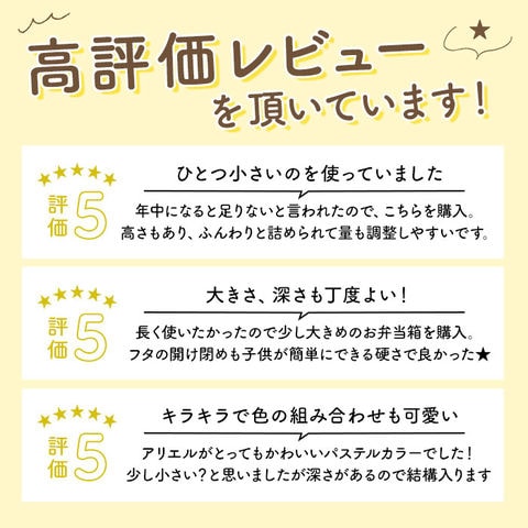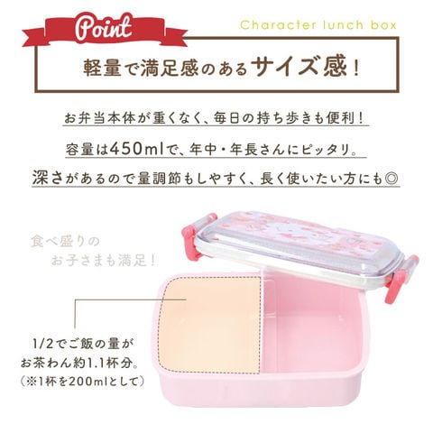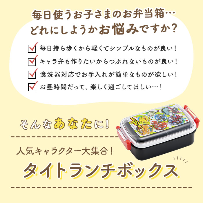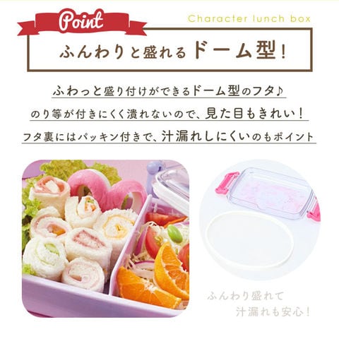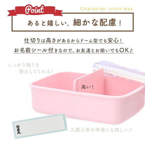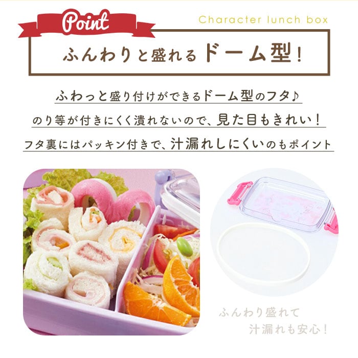 | 商品説明 | ふんわり盛り付けできるドーム型のフタがポイント♪お弁当が可愛く”映える”キャラクターデザインのランチボックス。【ふわっと盛っておいしさアップ★】ドーム型のフタは、のりやふりかけがフタにつきにくい!押し潰れを防いで見た目もきれい♪【しっかり密閉して汁漏れをガード】・2点ロック式&フタ裏にはパッキン付き。汁漏れしにくく持ち運び時も安心。【お子さまにぴったりなサイズ感】片手で持ちやすく、屋外でのお食事にも便利な1段式。容量は約450ml、お弁当箱1/2に入るご飯の量は、お茶わん約1.1杯分。(※お茶わん1杯分を約200mlとして算出)【キレイな盛り付けをキープ】おかずが片寄りにくい高い仕切り付き。お好みの位置に微調整可能。【熱々ごはんを味わえる♪】フタを外して電子レンジでの温めOK。温め直せば、いつでもあったかごはんを楽しめちゃう!【お手入れがラクチン】うれしい食洗機対応。お手入れしやすく、忙しいママも笑顔に☆【抗菌仕様で衛生的】抗菌効果のある銀イオンを練りこんだ素材を使用。いつも清潔をキープ。(※抗菌加工を施しておりますが、すべての細菌の増殖を抑制するものではありません。)【ネームシールが付属】名前を記入できるから、お友達とお揃いでも大丈夫。【お気に入りをチョイス】みんな大好きなキャラクターが大集合!お気に入りのキャラクターと一緒なら、ランチタイムがもっと楽しくなること間違いなし◎安心の日本製。 |
