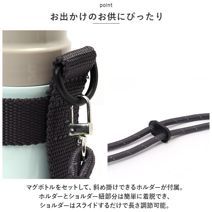 | 商品説明 | 簡単持ち運び♪外出先でも使いやすいホルダー付き「ステンレス製おでかけマグボトル」480mlサイズが新登場。【お出かけのお供にぴったり】マグボトルをセットして、斜め掛けできるホルダーが付属。ホルダーとショルダー紐部分は簡単に着脱でき、ショルダーはスライドするだけで長さ調節可能。【保温保冷両用でオールシーズン活躍】本体内側と外側が真空断熱された、ステンレス2重構造タイプ。冷たいものも温かいものも飲み頃温度をキープ!【ゴクゴク直飲みOK】フタをサッと開けて直接飲むことができ、氷が落ちてくるのをガードできるアイスストッパー付き。口当たりが優しい、こだわりの飲み口形状もポイント。【うれしい2wayタイプ】直飲みはもちろん、せんユニットをコップとして使ってもOK。シーンに合わせて使い分けできるのが嬉しい!【いつも清潔】せんパッキンにはガイドを設けているから、取り外しが簡単。少ないパーツでお手入れラクラク!【色んなシーンで活躍】長時間のお出かけやレジャーシーンなどでも重宝する、容量480mlサイズ。スマートに持ち運べる軽量設計。【選べるカラー】年代問わず持ちやすい、落ち着きのあるカラーバリエーション。家族色違いで揃えるのもおすすめ。 |