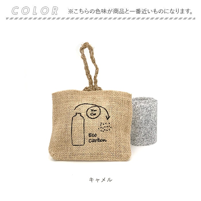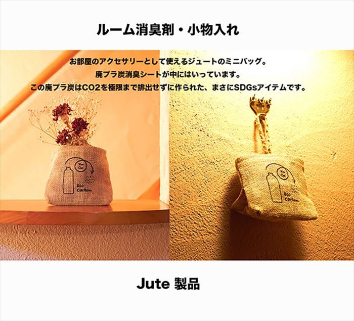 | 商品説明 | 防臭・防虫効果があるジュート素材のミニバッグの中に抗菌・防臭効果の高い廃プラ炭(活性炭)シートを入れたお部屋飾りとして使える消臭ルームアクセサリー。 この廃プラ炭(活性炭)シートは、CO2の排出を極限まで減らして作られた地球にやさしいシート。ミニバッグは小物入れとして、別の用途でも使えます。またみにバッグはジュートで作られており、ジュートは生息時、通常の木に比べて5~6倍CO2吸収量が多く成長が早い植物。活用されずに伐採すると燃やすしかないため吸収してくれたCO2を排出しなければならない。消臭効果が期待できて生分解性も高い植物です。 |