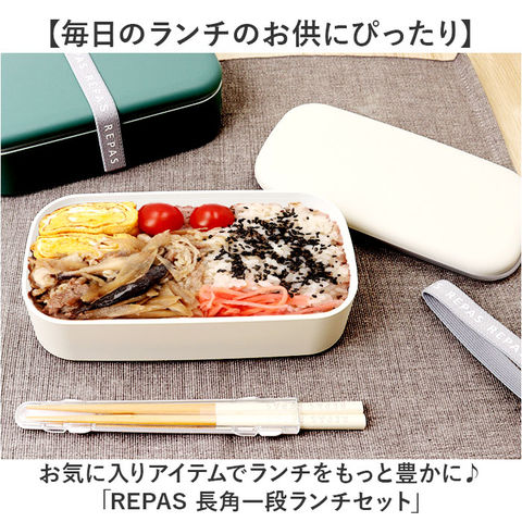 | 注意点 | [付属品]ゴムバンド x 1本[REPAS 長角一段ランチ]電子レンジ:可 (中蓋は使用不可) 食洗機:可 (中蓋は使用不可)[REPAS 箸セット18cm]食洗機:可お取り扱いの際は、商品やパッケージなどに記載されている品質表示、アテンションタグ、ご使用上の注意事項などを必ずご確認下さい。本来の目的以外にはご使用にならないで下さい。カメラやモニターの性質により、画像と実物の色の違いがある場合がございますのでご理解願います。 |
