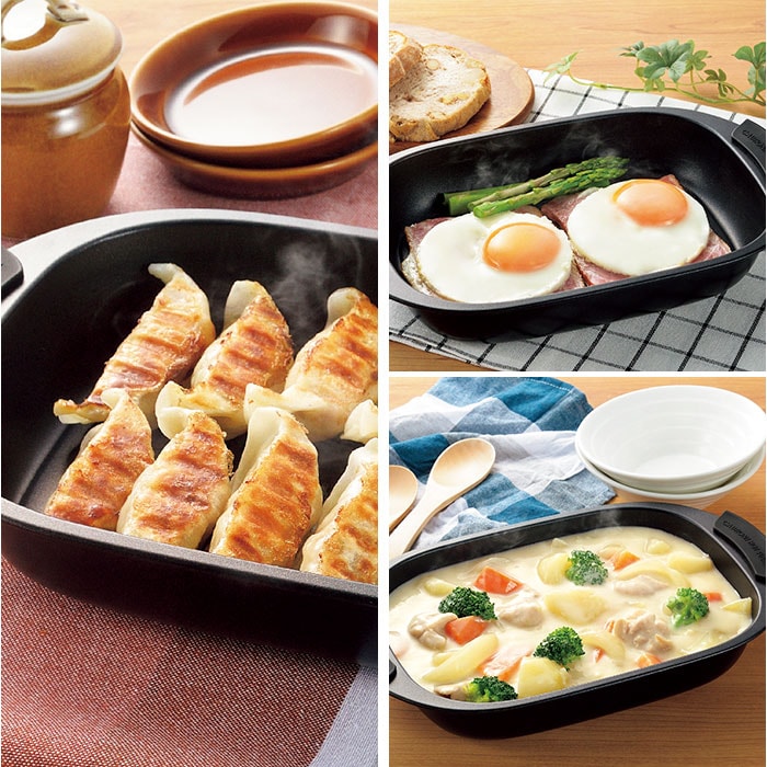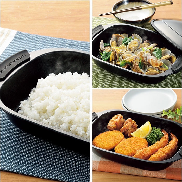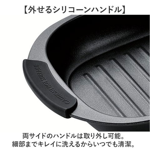 | 素材 | [本体]鉄(アルミメッキ) [底部]発熱性シリコーンゴム [蓋]鉄(アルミメッキ)、シリコーン焼付塗装 [ハンドル・ツマミ]シリコーンゴム 【表面加工】 [内面]ふっ素樹脂塗膜加工 [外面]シリコーン焼付塗装 |