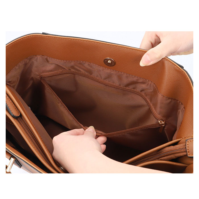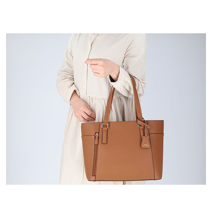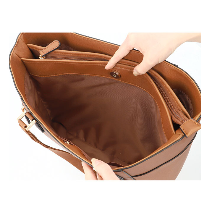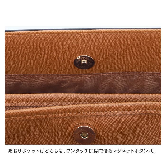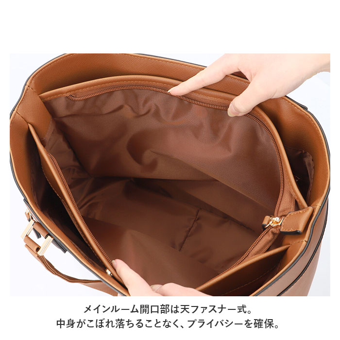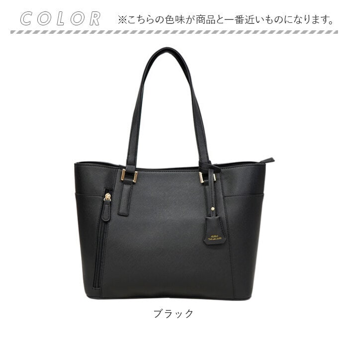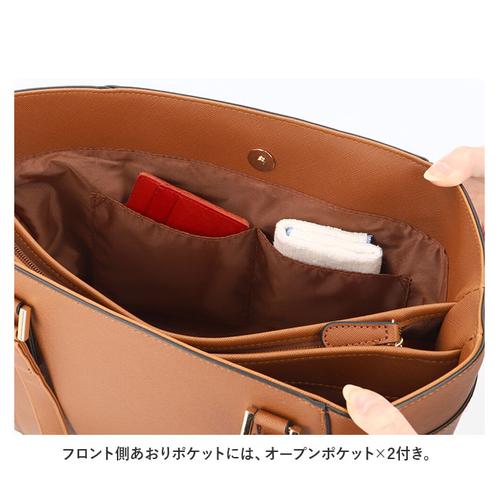 | 商品説明 | ビジネスにもカジュアルにも使える!両あおりポケット付きのA4合皮トートが登場。A4サイズがぴったり収納可能!通勤・通学に最適なトートバッグ。(※あおりポケットにA4サイズの物を収納した場合、開口部が閉まりにくい可能性があります。)メインルーム開口部は天ファスナー式。中身がこぼれ落ちることなく、プライバシーを確保。内側は程よくマチがあり、500mlペットボトルが縦向きにぴったりと収納OK!長財布やコスメポーチなどもラクラクIN。あおりポケットはどちらも、ワンタッチ開閉できるマグネットボタン式。フロント側あおりポケットには、オープンポケット×2付き。背面側のあおりポケットには、ファスナーポケット×1を配置。フロント片側に縦ファスナーポケットは、サッと取り出したい小物の収納に便利。持ち手が長めなので肩掛けがしやすく、持ち運びもスマート♪上品で落ち着いた雰囲気に仕上げてくれるフェイクレザー素材。持つ人を選ばないシンプルなデザイン◎取り外し可能なチャームがアクセント。 |