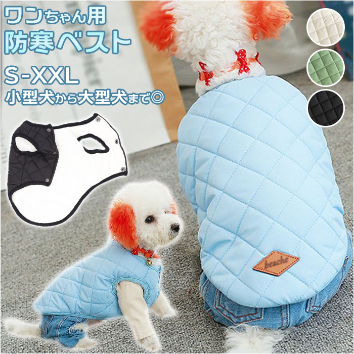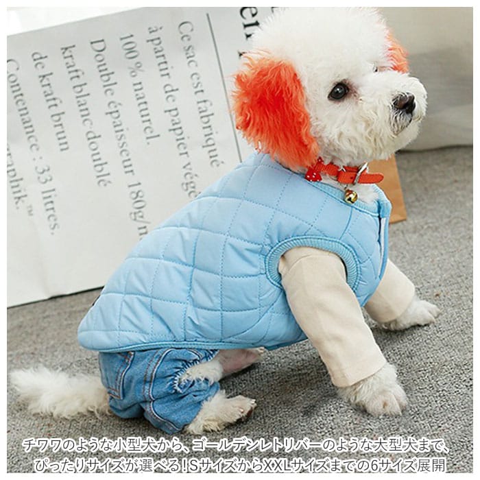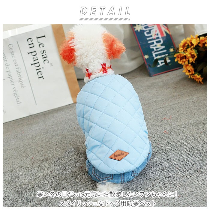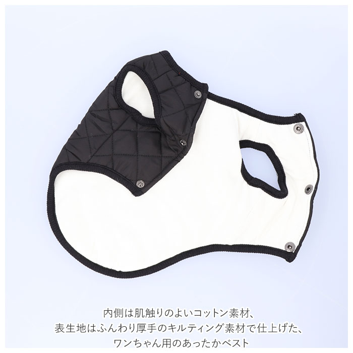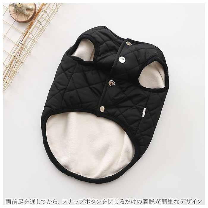 | 商品説明 | 寒い冬の日だって元気にお散歩したいワンちゃんに!スタイリッシュなドッグ用防寒ベスト。内側は肌触りのよいコットン素材、表生地はふんわり厚手のキルティング素材で仕上げた、ワンちゃん用のあったかベスト。両前足を通してから、スナップボタンを閉じるだけの着脱が簡単なデザイン。コーギーやフレンチブルドッグなど手足の短めなワンちゃんでもピッタリ着れるノースリーブタイプ!チワワのような小型犬から、ゴールデンレトリバーのような大型犬まで、ぴったりサイズが選べる!SサイズからXXLサイズまでの6サイズ展開。しんしんと冷える寒い日や小雪の舞う日も、モノトーンやパステルカラーのベストでオシャレにお散歩♪ |