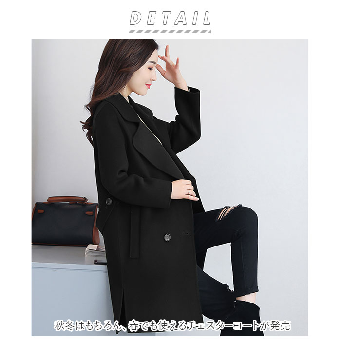 | 商品説明 | 秋冬はもちろん、春でも使えるチェスターコートが発売。ダブルボタン仕様の膝上丈。横スリットが入ったシンプルなコート。前面のポケットが2つ付きでスマホが入るサイズ感。裏地付きなので、袖を通しやすいのもうれしい。スッキリとしたシルエットなので、普段使いはもちろん、通勤通学でも着回しがしやすいアイテム。 |
