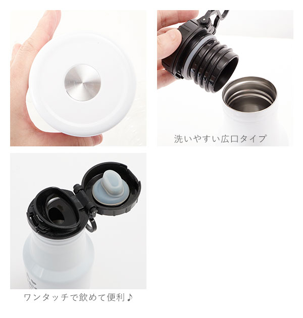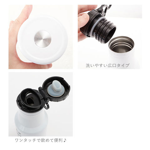| 注意点 | ご使用前に説明書を必ずご一読ください。ワンタッチボトルの開閉ボタンを指や爪ではじくように開けたり、左右どちらか極端に力をかけるような開け方をすると、内部バネの反発が強まり衝撃で開閉ボタンが飛び出す場合がございます。ご使用の際は開閉ボタンの中央を指で優しく押して開けてください。熱い飲み物を入れた場合は、注意してお飲みください。急に傾けると中の液体が勢いよく飛び出てやけどやケガの原因となります。断熱効果により、熱い飲み物を入れても外側は熱くなりません。アルコール類・腐敗しやすい牛乳・乳性飲料・果汁などを入れないでください。腐敗や変質の原因になります。また腐敗などによりガスが発生して内圧が上がり、栓ユニットが開かなくなる、飛ぶ、中の液体が吹き出るなどして、ケガや汚れの原因になります。ドライアイス・炭酸飲料は入れないでください。内圧が上がり破損や吹きこぼれの原因になります。カメラやモニターの性質により、画像と実物の色の違いがある場合がございますのでご理解願います。 |