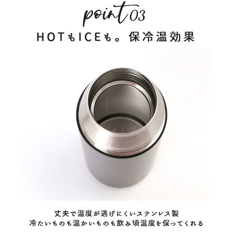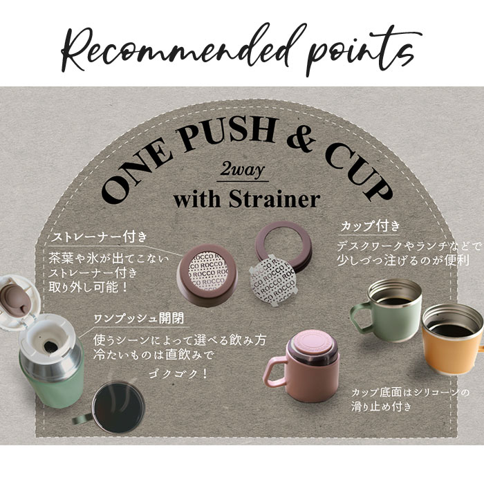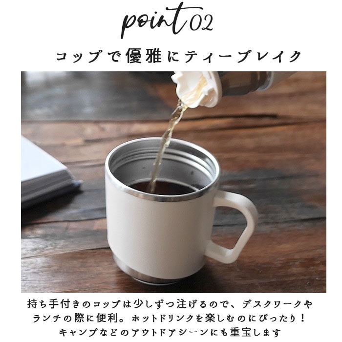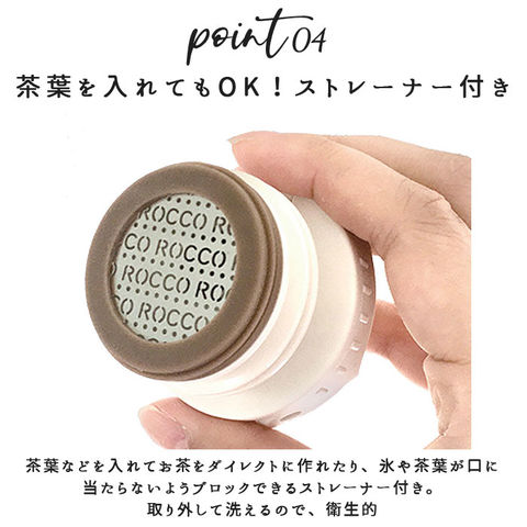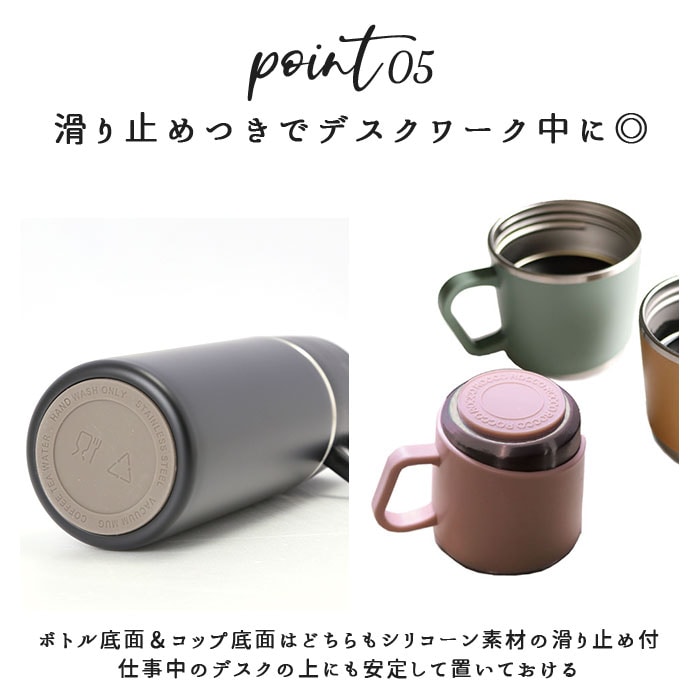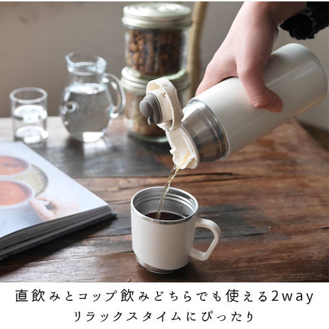 | 商品説明 | こまめな水分補給にぴったり!直飲みとコップ飲みどちらでも使える2wayボトル(350ml)が発売。保温保冷効力があるので、冷たいものも温かいものも飲み頃温度を保ってくれる。コップを外すとワンタッチで中の栓が開けられるワンプッシュ開閉!冷たい飲み物は直接口をつけてゴクゴク飲むことができる。持ち手付きのコップは少しずつ注げるので、デスクワークやランチの際に便利。コップに注ぐことで、コーヒーやお茶のフレーバーを楽しめるのが嬉しい。ボトル底面&コップ底面はどちらもシリコーン素材の滑り止め付きだから、仕事中のデスクの上にも安定して置いておける。茶葉などを入れてお茶をダイレクトに作れたり、氷や茶葉が口に当たらないようブロックできるストレーナー付き。取り外して洗えるので、衛生的。1年中使えていつもバッグにいれておきたいアイテム♪ |