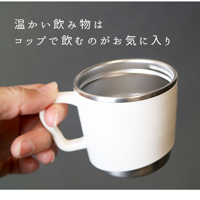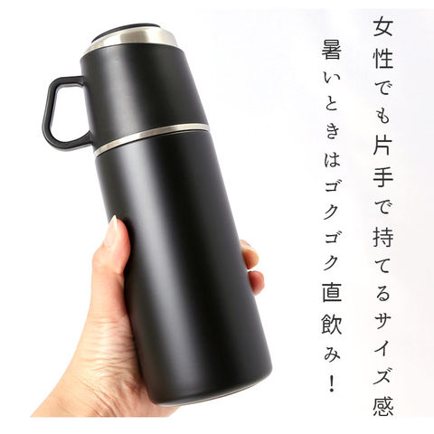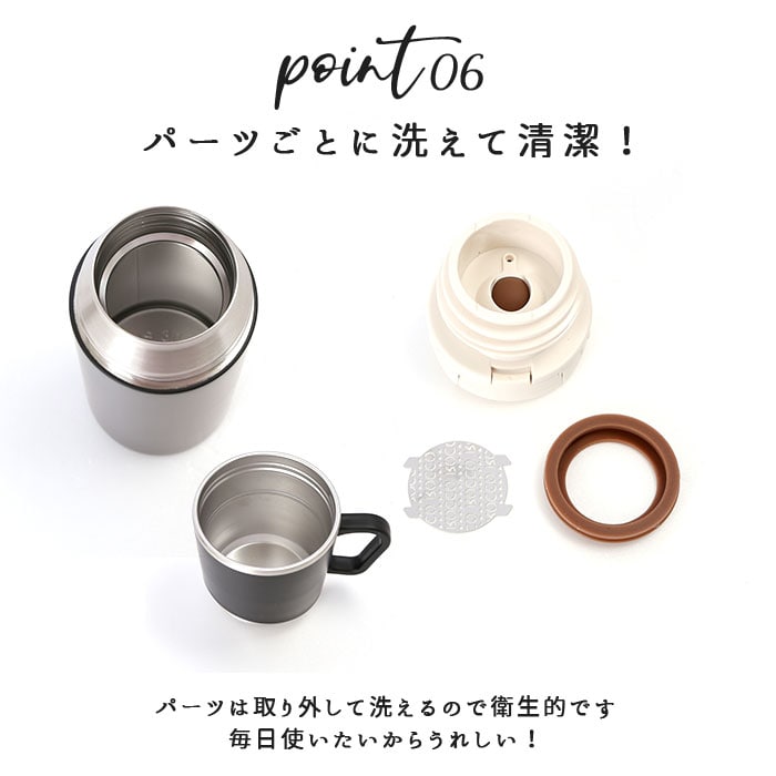 | 注意点 | 乳幼児の手の届くところに置かないでください。また、いたずらには十分に注意してください。熱い飲み物を入れた場合は、注意してお飲みください。急に傾けると中の液体が飛び出てやけどやケガの原因となります。断熱効果により、熱い飲み物を入れても外側は熱くなりません。(コップは断熱されてないので、熱い飲み物を入れた際には、ステンレスの部分を触らないよう注意してください。)持ち運ぶ際は栓が確実に閉まっている事を確認してください。閉め方が不充分だと、中の液体がもれ、やけどやケガ・ものを汚す原因となります。バッグ等に入れる際は万が一の漏れを防ぐために本体を縦に置いてください。ストーブやコンロ等の火気や、高温になる所に置かないでください。やけどや変形、変色の原因になります。飲み物は入れすぎないように注意してください。入れすぎると、栓をした際に内容物があふれたり、やけどのおそれがあります。ドライアイス・炭酸飲料は入れないでください。内圧が上がりフタが開かなくなったり破損や飲食物が吹き出すなどしてケガや他のものを汚す原因になります。使用後は必ず、その日のうちにお手入れしてください。とくにスポーツドリンクなどの塩分を含んだ液体を入れた場合は、すぐに本体内部を水ですすいでください。カビの発生、サビや穴があくなどの原因となります。煮沸洗浄をしないでください。変形や漏れる等の原因になります。つけ置き洗いや食器洗い乾燥機は使用しないでください。小さなすき間に水が入り、サビや保温・保冷障害の原因になる場合があります。電子レンジは使用しないでください。本体の変形、変色の原因になります。カメラやモニターの性質により、画像と実物の色の違いがある場合がございますのでご理解願います。 |