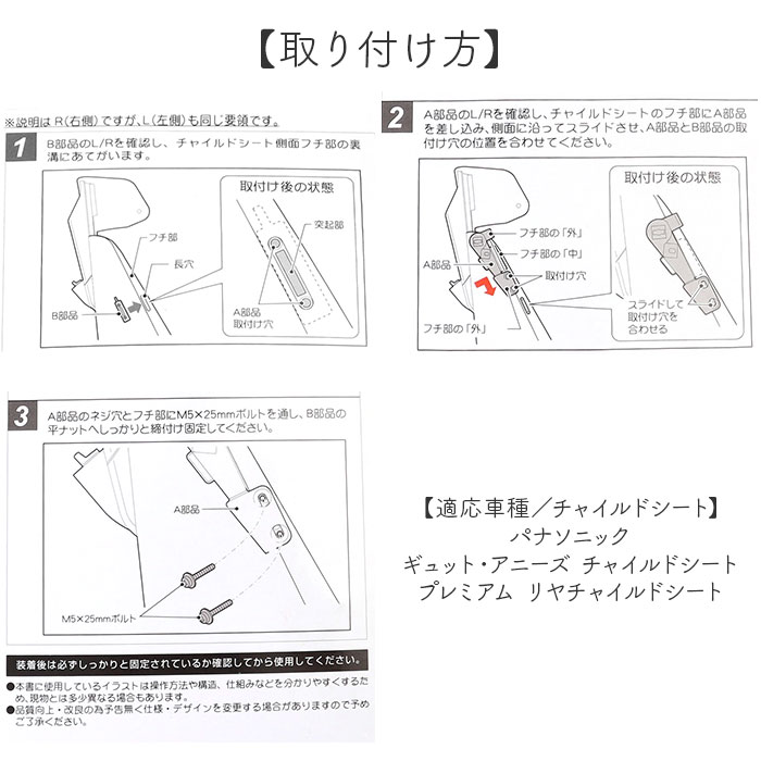 | 注意点 | 【チャイルドシートカバー】[適応チャイルドシート]・パナソニック プレミアム・リヤチャイルドシート【アタッチメント】[付属品]ボルト x 4個(プラスドライバーはご用意ください)お取り扱いの際は、商品やパッケージなどに記載されている品質表示、アテンションタグ、ご使用上の注意事項などを必ずご確認下さい。本来の目的以外にはご使用にならないで下さい。カメラやモニターの性質により、画像と実物の色の違いがある場合がございますのでご理解願います。 |