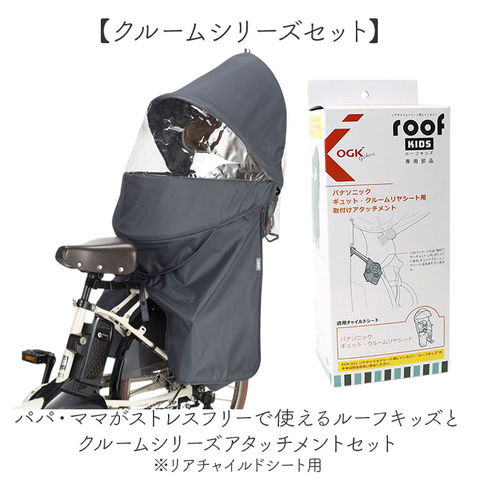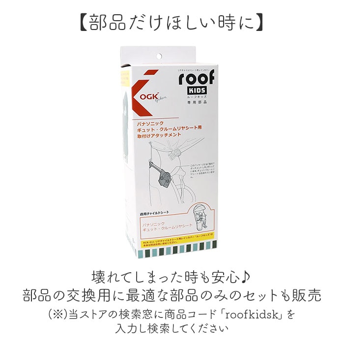 | 商品説明 | 【クルームシリーズセット】パパ・ママがストレスフリーで使えるルーフキッズとクルームシリーズアタッチメントセット※リアチャイルドシート用【天気や気分に合わせて使える】お天気などで選べる4つのモード!雨の日はもちろん、晴れの日の日除けとしても活躍☆【寒い日モード】フルカバーで足先から頭まで冷たい風をしっかり防ぐ。【雨の日モード】フルカバー状態で窓下のフラップを上げることで、通気性をUP!梅雨の時期でも蒸れを軽減。【日除けモード】上カバーだけ使うことも可能。日差しから守りつつフロントオープンで風通しもGOOD。【乗り降りモード】上部が大きく開く構造とファスナーレスで載せ降ろし簡単◎保育園や幼稚園の送迎に最適!【簡単着脱できる下カバー】バックルでカチッと簡単に付け外しができる下カバー。シーンに合わせてサッと対応しやすい◎【使わないときは収納可能】外した下カバーは袋に収納でき、運転中の邪魔になったり置き場所に困らない♪【窮屈感を感じない広々空間】天井部分はゆとりのある作りで広々とした空間を演出。窮屈感を感じにくい設計に。【専用のアタッチメント付き】クルームシリーズの専用アタッチメント付きで届いてからすぐに取り付け可能◎(※)(※)必ず専用のアタッチメントと一緒にチャイルドシートの取り付けを行ってください。(※)クルームシリーズ専用のアタッチメントのみ付属しております。他会社対応のアタッチメントは付属しておりません。【パパさんも使いやすいカラー】ベーシックなカラーでママさんはもちろん、パパさんも使いやすい♪【部品だけほしい時に】壊れてしまった時も安心♪部品の交換用に最適な部品のみのセットも販売※(※)当ストアの検索窓に商品コード「roofkidsk」を入力し検索してください。<<適応車種>>パナソニック ギュット・クルームリヤシート |