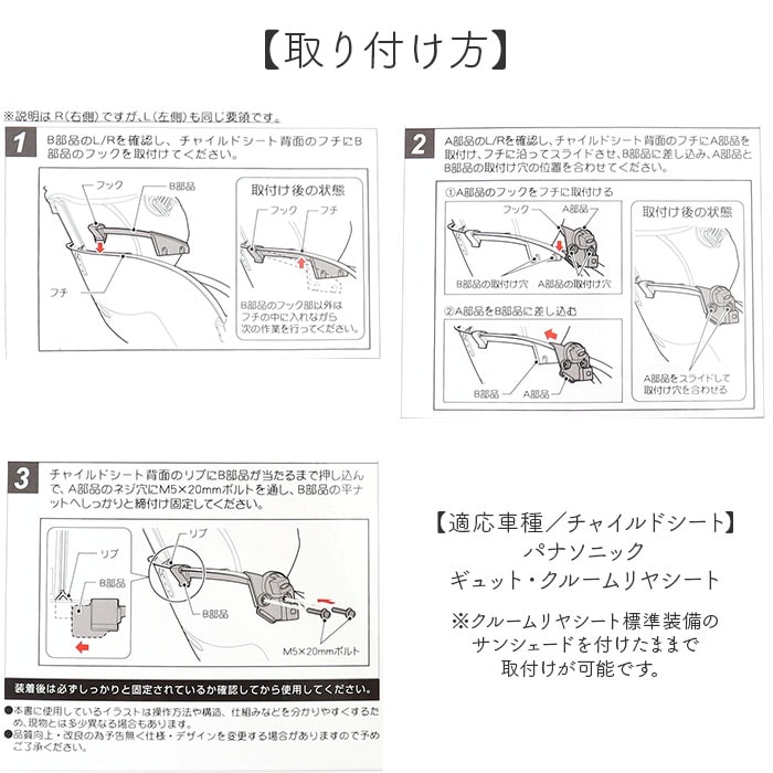 | 注意点 | 【チャイルドシートカバー】[適用チャイルドシート]・パナソニック ギュット・クルームリヤシート【アタッチメント】[付属品]ボルト x 4個(プラスドライバーはご用意ください)お取り扱いの際は、商品やパッケージなどに記載されている品質表示、アテンションタグ、ご使用上の注意事項などを必ずご確認下さい。本来の目的以外にはご使用にならないで下さい。カメラやモニターの性質により、画像と実物の色の違いがある場合がございますのでご理解願います。 |
