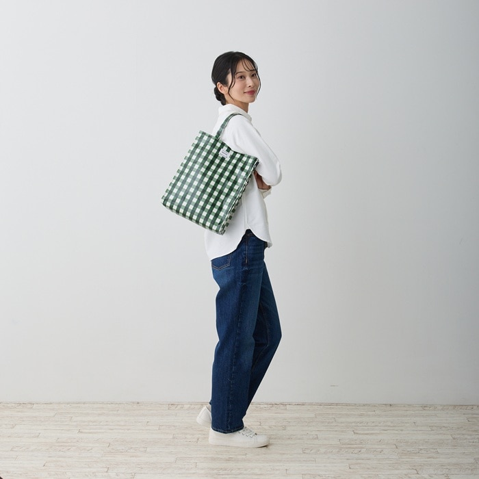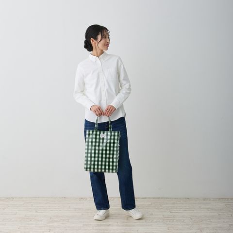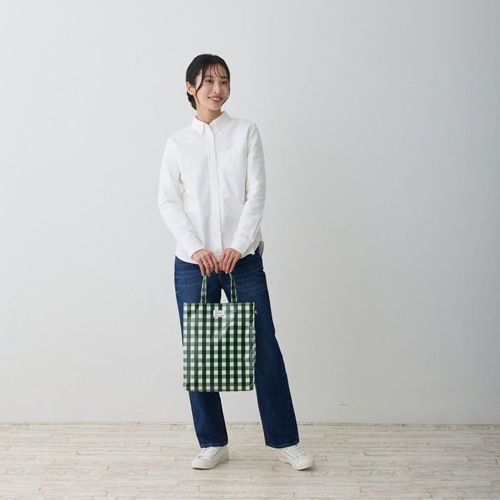 | 素材 | 表地:綿(ノンフタル酸PVCラミネート加工)/裏地:ポリエステル 持ち手:綿(ノンフタル酸PVCラミネート加工)/底板:ベルポーレン/留め具:マグネットホック |