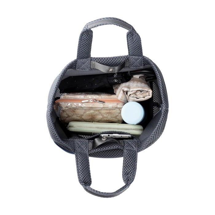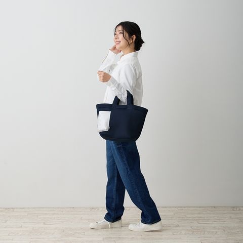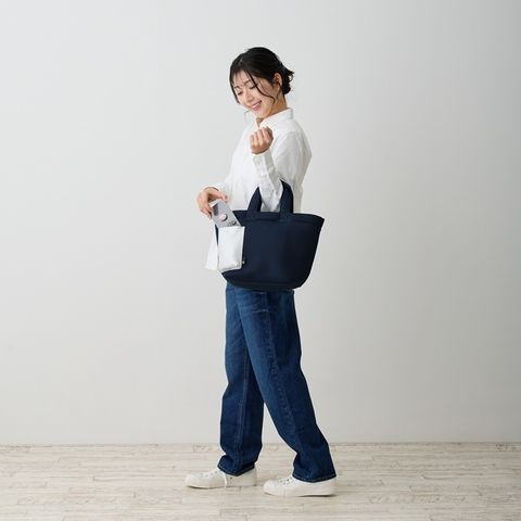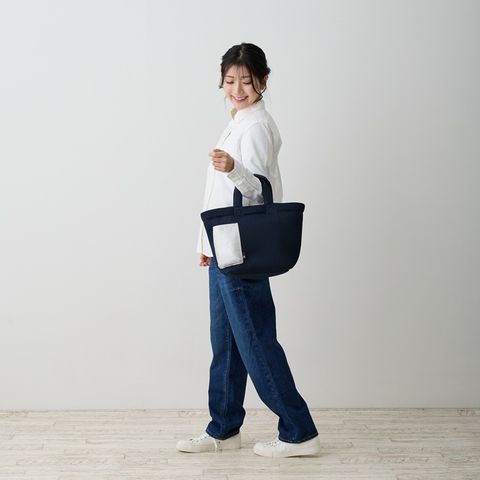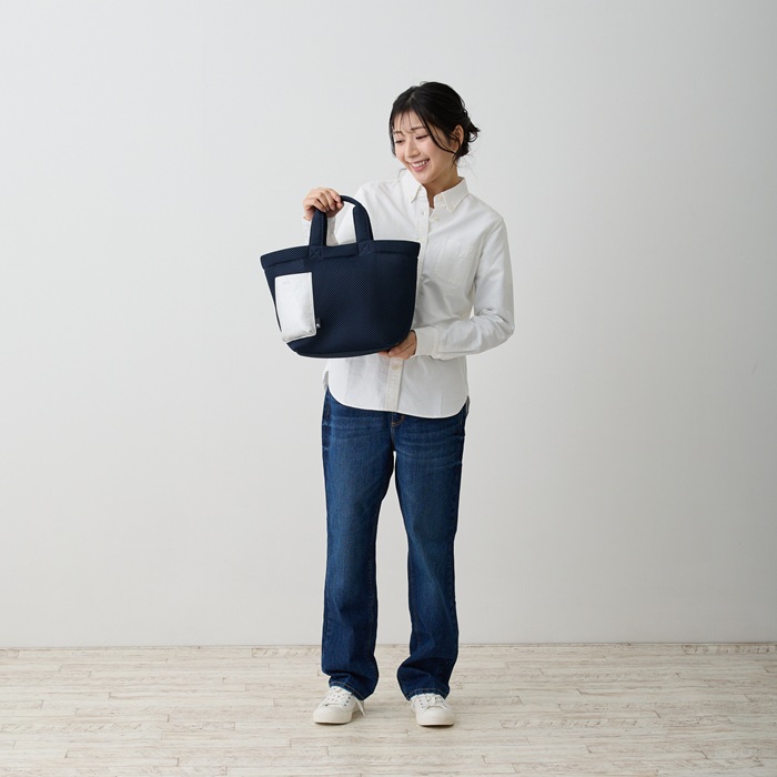商品説明ベーシックカラーでオトナシックに!合皮のルーポケットがアクセント。立体感のあるルーポケットは、サッとだしたいものの指定席。スマホなど頻繁に出し入れするアイテムの収納に便利。普段使いにちょうどよいサイズ。お財布、ボトル、A5ノート、ポーチなどらくらく収納!底板付きで、モノを入れてもたわまず、しっかり安定して収納できます。ドットボタン開閉で、中身を隠せて安心です。フワフワでサラリとした手触りは暑い季節にもベタつかず、快適。いつでも清潔に。汗ばむ季節のデイリーなご使用にオススメ!手洗い可能(手おし洗い推奨)で、衛生的に安心してご利用いただけます。季節を問わず大活躍です。