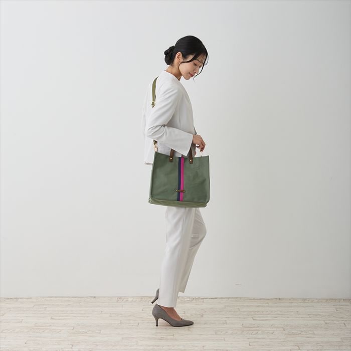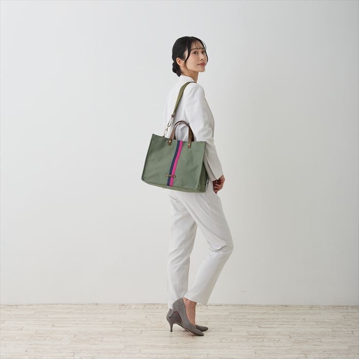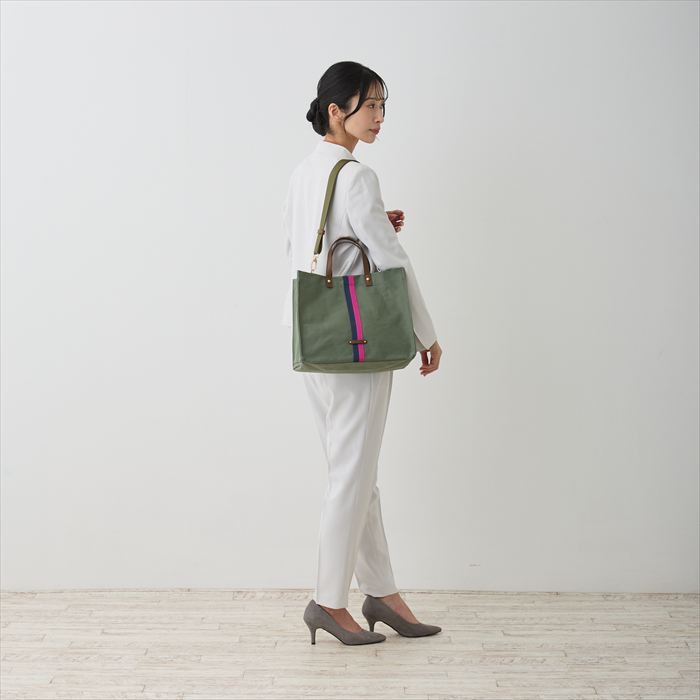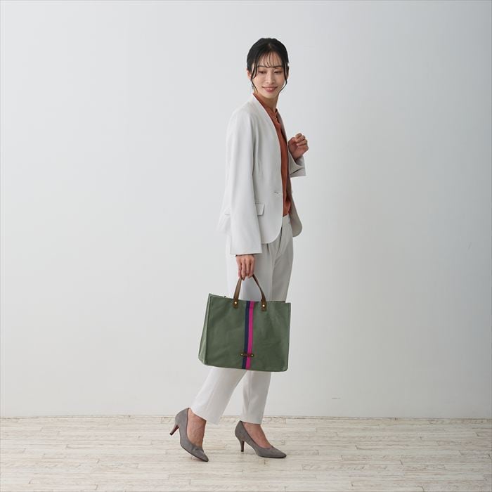 | 商品説明 | キリッと四角いフォルム。A4ファイルが横にぴったり収まるサイズです。幅が広めの箱マチで、お弁当箱なども収納可能。内側をラミネート加工しているため、しっかり自立して、モノの出し入れがしやすいのもうれしいポイント。底板付きで、底面がたわまずきれいな形をキープしてくれます。口元はマグネット開閉。内側には2つに仕切られたオープンポケットがついています。取り外し&長さ調節可能なショルダーベルト付き。手持ち、肩掛け、斜め掛け、シーンに応じた持ち方が可能です。両サイドのルーポケットは、出し入れ頻度の高いアイテムの収納に便利です。綿キャンバスのカジュアルな雰囲気と、すっきりとシャープなフォルムが融合。普段使いはもちろん、お仕事バッグとして、オフィスカジュアルスタイルにもピッタリはまります。 |