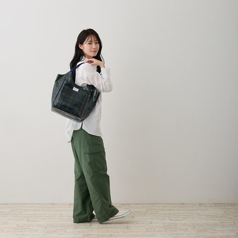 | 素材 | 表地:綿 ノンフタル酸PVCラミネート加工/裏地:ポリエステル/持ち手:ポリエステル 底板:ベルポーレン/留め具:ドットボタン |