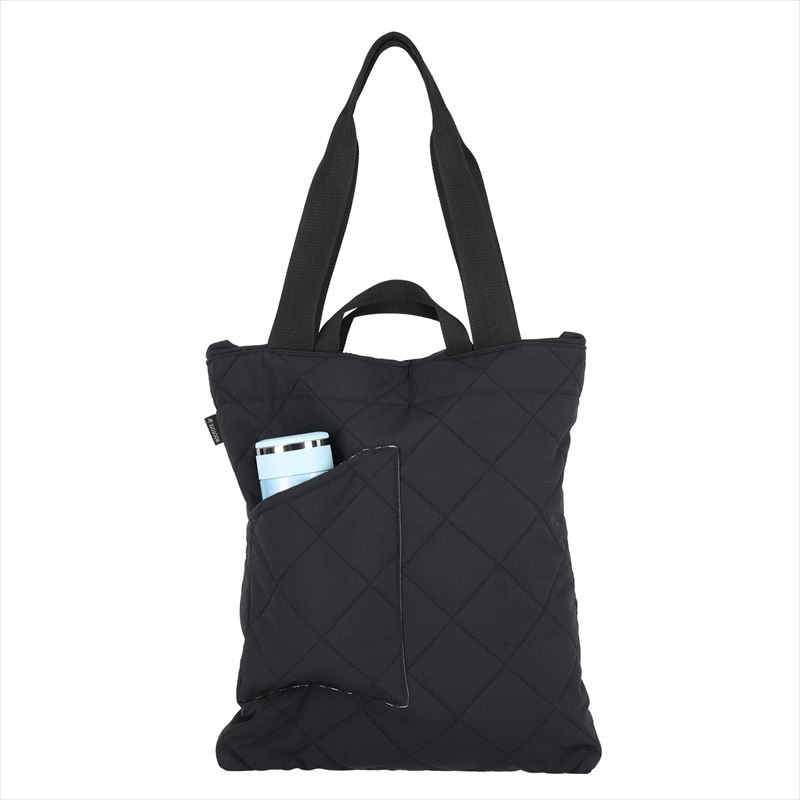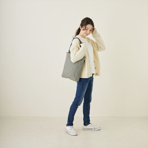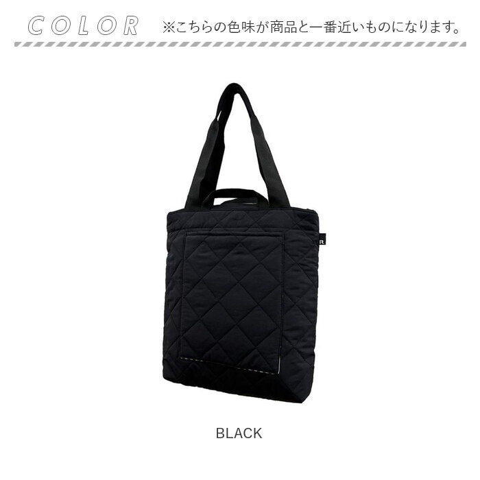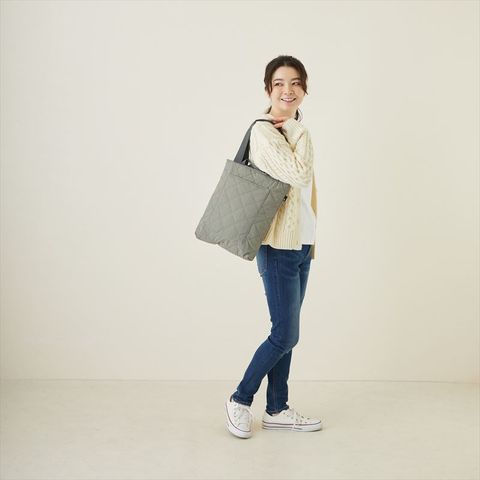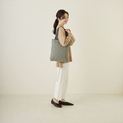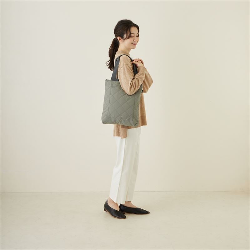 | 商品説明 | まいにち使えて飽きのこない機能的なバッグ。汚れや水に強い「撥水加工」。雨の日も晴れの日もデイリーに使える頼もしいトートです。軽くて丈夫なナイロン生地に、菱形(ダイヤモンドシェイプ)キルティング加工を施しました。中綿入りで布地にプクッと立体感が出て、おしゃれでかわいい仕上り。ベーシックカラーにちらりと見えるストライプ柄の裏地が程よいアクセントに!A4サイズの書類が縦に収納できるサイズ。13インチのノートPCが収納可能で、ビジネスバッグとしても重宝します。前面には大きめのポケット、背面には小物用の小さめルーポケットがあります。すぐ取り出したい物を収納。トートを肩掛けしたまま出し入れもできます。長さが異なる便利な2種類の持ち手。用途に合わせて手持ち、肩掛けと使い分けができます。体に寄り添うやわらかさ、使いやすい触り心地。どんなファッションにも合わせやすく、季節を問わず大活躍です。 |