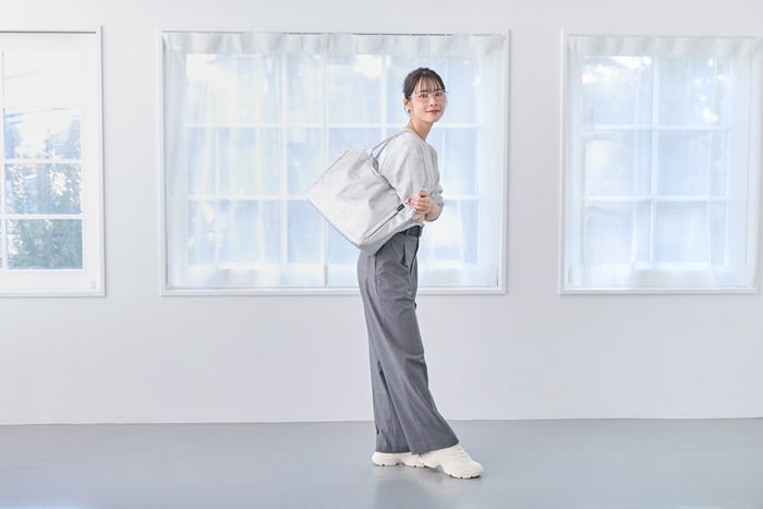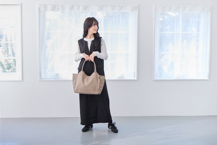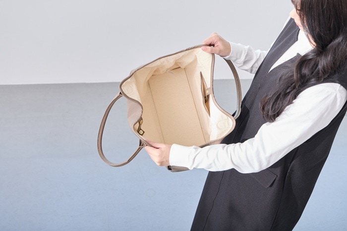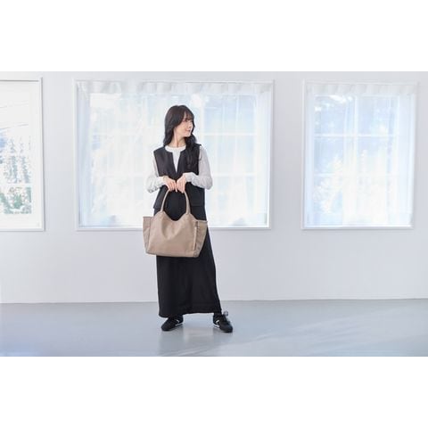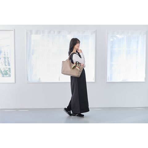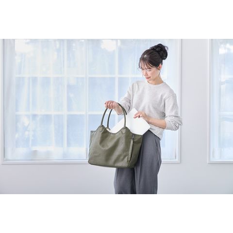 | 商品説明 | お仕事の日も、休日のお出かけも。どんなシーンにもそっと寄り添ってくれる万能トート。やわらかく、手触りのいい上質な合皮素材。ほどよいマット感と自然なシボ感で、本革のような風合いです。きちんと感がありながらもかしこまりすぎず、大人の毎日にぴったりの存在。持ち手は、肩掛けも手持ちもバランス良く持てる絶妙な長さと太さ。肩にかけてもずれにくく、手に持った時も美しくきまります。ほどよいマチ幅で、体に沿うようにフィット。持った姿まできれいに見せてくれます。A4サイズの書類や雑誌が横向きで入る収納力。さらに、荷物が多くても型崩れしにくい底板入りで、すっきりとしたシルエットをキープ。開け口も大きくて、自立するから中のものが取り出しやすい。開け口には3段階で留められるホック付き。荷物の量に合わせて調整できるから、見た目も使い勝手も◎【3つの留め方】・1:口元が広がりにくい安心な留め方。・2:適度な余裕を持たせた、中身の出し入れがスムーズな留め方。・3:荷物が多いときの広々した留め方。外側のファスナー付きのルーポケットがポイント。スマートフォンや鍵など、すぐに取り出したいアイテムを入れておけば、バッグの中で探す手間もありません。内側は、厚手で丈夫なカツラギ生地を採用。上質感がありながら、手触りもやわらか。深めの内ポケット付きで、細かなアイテムの整理整頓もしやすくなっています。デザインはあくまでシンプルに。ROOTOTEのロゴがさりげなく素押しされた上品なミニマル感。スーツにもカジュアルにもすっと馴染み、コーディネートを選ばない使いやすさと心地よさ。機能性と美しさを両立したこのトートが、あなたの毎日に寄り添います。時には、お気に入りのスカーフやチャームでアレンジして、自分だけの一品に。シンプルなフォルムだからこそアレンジが映えます。きちんと感はそのままに、洗練された個性をまとえば自然に溶け込む“私らしさ”が完成します。 |
