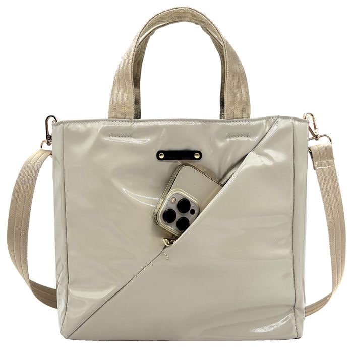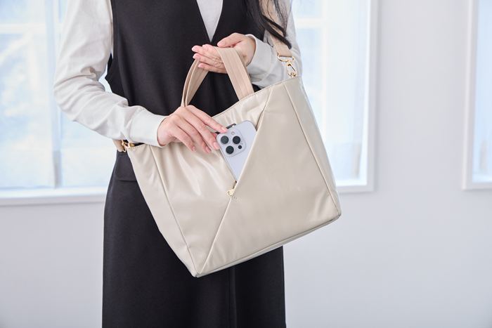 | 商品説明 | 上品な光沢感のある生地。すべすべとした手ざわりは持つたびに心地よく、雨の日のちょっとした水濡れもサッとひと拭きで安心。毎日気兼ねなく使える頼もしさは、デイリーバッグにぴったり。トートバッグとショルダーバッグの2way仕様。取り外し可能なショルダーベルト。長さ調整も自在で、手持ち肩かけ斜めかけと気分やシーンに合わせてスタイルを変えられます。見た目以上の収納力。長財布やスマホ、ポーチや500mlボトルまで必要なものがすっきりと収まります。スクエアフォルムならではの安定感で、持ったときの印象もスマート。正面のななめに走るラインはデザインのアクセントでありながら、ROOTOTEならではのルーポケット。デザインと機能がひとつになった工夫。よく使うスマホやリップが、サッと取り出せてスムーズ。さらに内側には3つのポケットが。ファスナー付きには大切なものを、オープンポケットにはすぐ取り出したい小物を。バッグの中で迷子になりがちなアイテムもきちんと整理できます。 |