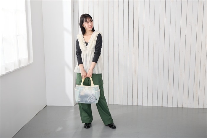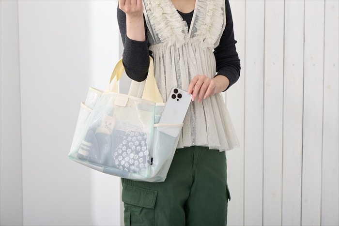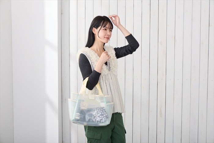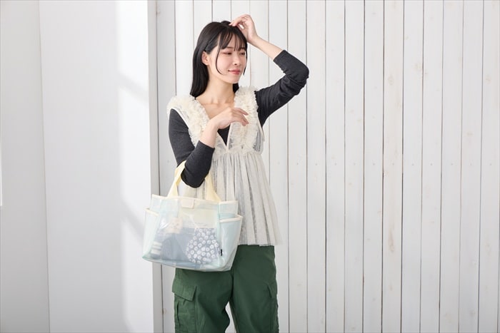 | 素材 | 表地:ポリ塩化ビニル/内側仕切り:ポリエステル/持ち手:ポリエステル/留め具:ドットボタン |