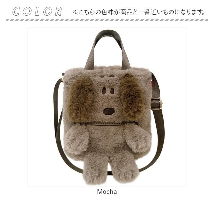 | 商品説明 | もふもふの手触りと、あどけない表情がたまらない、癒し系トート。まるでぬいぐるみを連れてお出かけしているよう。いつでもあなたに寄り添う、楽しいお出かけのパートナーです。ちょっとそこまで”こでかけ”のおともに「べビール―」。トートバッグとしてもショルダーバッグとしても。ショルダーは長さ調整が可能で、お好きな長さで使えます。手持ち、肩掛け、斜め掛け、両手フリーで、アクティブに!背面の大きめルーポケットには、背中のブチ模様とかわいいしっぽのデザインもしっかり再現されています。すぐ取り出したいリップクリームやハンカチの収納に。 |