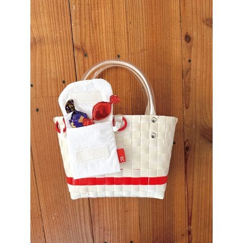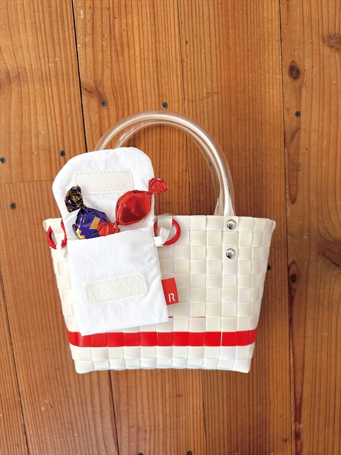 商品説明軽くてカラフルなミニバスケット型 。コロンと小ぶりなフォルムがかわいい!カラフル&ハリのある荷造りテープが素材。ベビールーサイズのトートに編み上げました。ちょっとそこまでのお出かけ”こでかけ”のお供に!円形カラビナで着脱可能なルーポケットを付属しました。付ける場所をアレンジしたり、単品でミニポーチとしても使用可能。フラップ付きで、イヤホンやアクセサリーなど細々とした物の収納に便利です。軽くて自立するトート。おでかけでの使用はもちろん、小物を収納してお部屋に置いて使っても!