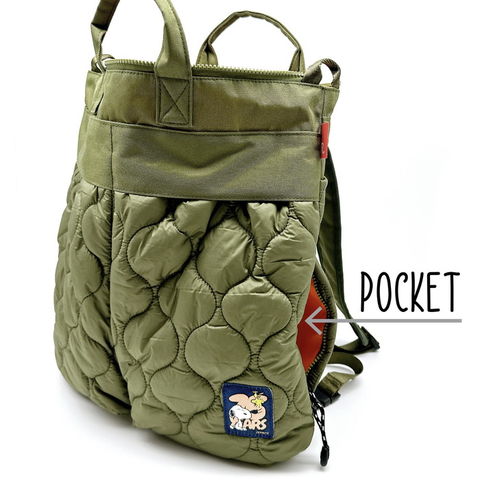 | 商品説明 | 75周年を記念した大きめネームがアクセント。ユニセックスで使えるミリタリーテイスト。前面のふっくら大きめポケットがキャッチーな2way「セオルー」。トートでもリュックでも、お出かけシーンに合わせて使い分け。A4サイズが余裕で入ります。口元は安心のファスナー開閉。鮮やかカラーの裏地で、中身もパッと確認できます。内側にも外側にもポケットが充実!用途ごとに細分化したポケットは、必要なものが迷子にならず整理して収納できます。荷物の仕分けがしやすい内ポケット。小物の収納に便利な2つのオープンポケットと、PCやタブレットの収納に安心な大きめウレタン入りポケット。ボトルホルダーもついているから、立て入れしたいアイテムはここへ。すぐに取り出したい持ち物は、外ポケットに。キルティング加工の大きめ前面ポケットは、プラホック開閉。背面全面を使ったポケットは、A4ファイルも収納できる大きさ。サイドのファスナー付きルーポケットには、スマホやパスケースなどの貴重品を入れておけます。背負ったままでも出し入れ可能で便利。トートバッグとして使う際には、リュック用のショルダーを背面のポケットにすっきり収納。邪魔にならない仕様になっています。口元両端のループに別売りのショルダーベルトを装着すれば、ショルダーバッグとしても使用可能です。 |