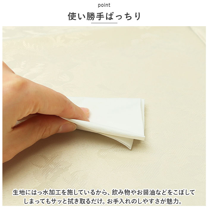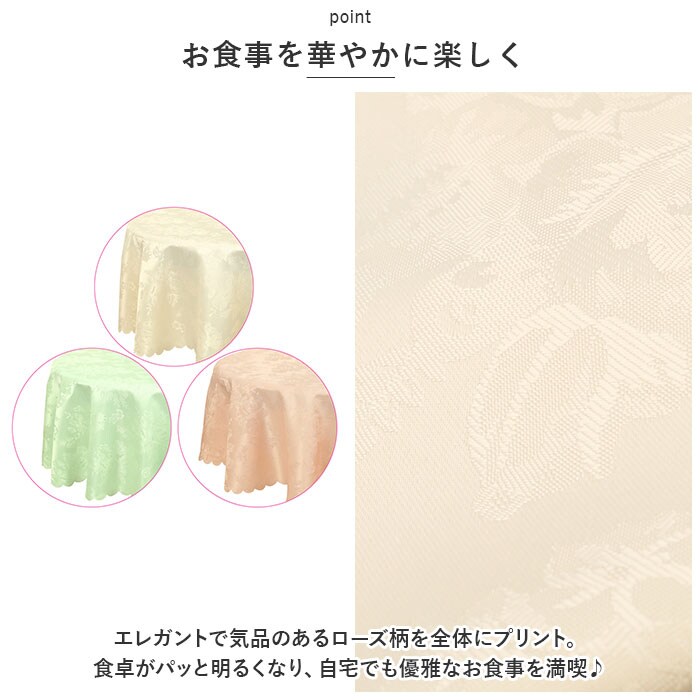 商品説明空間を素敵に彩る♪上品なローズ柄の「ラウンドクロス」が新登場。【お食事を華やかに楽しく】エレガントで気品のあるローズ柄を全体にプリント。食卓がパッと明るくなり、自宅でも優雅なお食事を満喫♪【使い勝手ばっちり】生地にはっ水加工を施しているから、飲み物やお醤油などをこぼしてしまってもサッと拭き取るだけ。お手入れのしやすさが魅力。【着脱もスムーズ】テーブルに掛けるだけで手軽にイメージチェンジ。来客時などちょっと気分を変えたい時にもおすすめ。【可愛さアップのポイント】裾には丸みのあるスカラップデザインをプラス。大人可愛い仕上がりに。