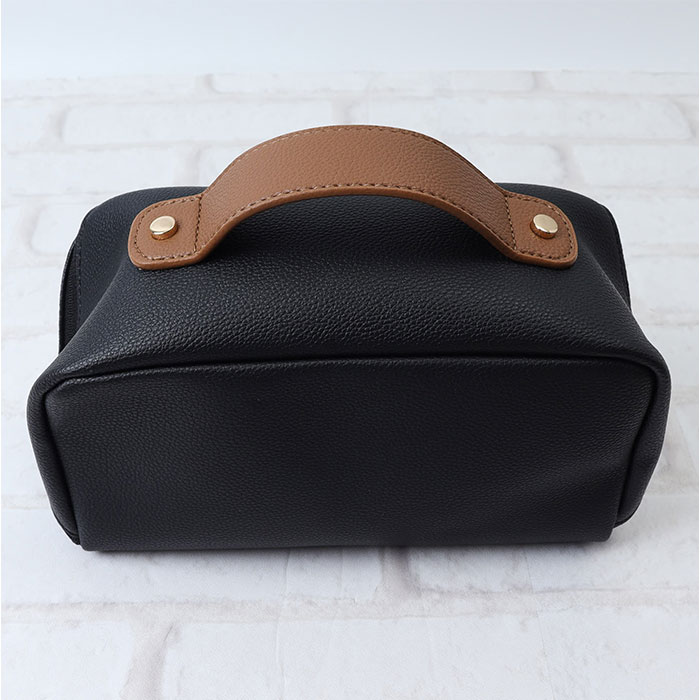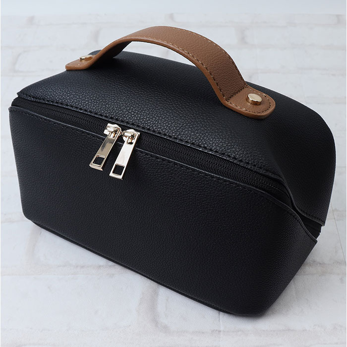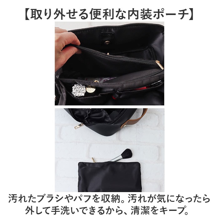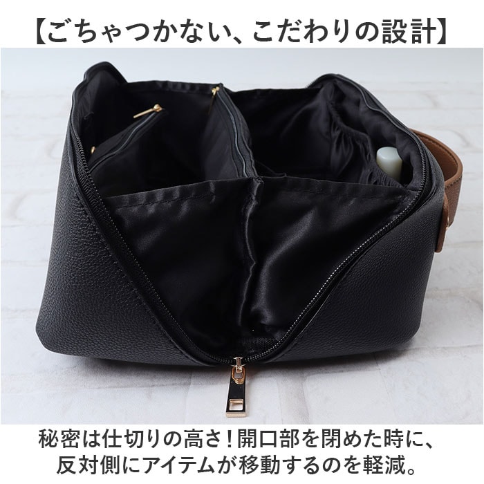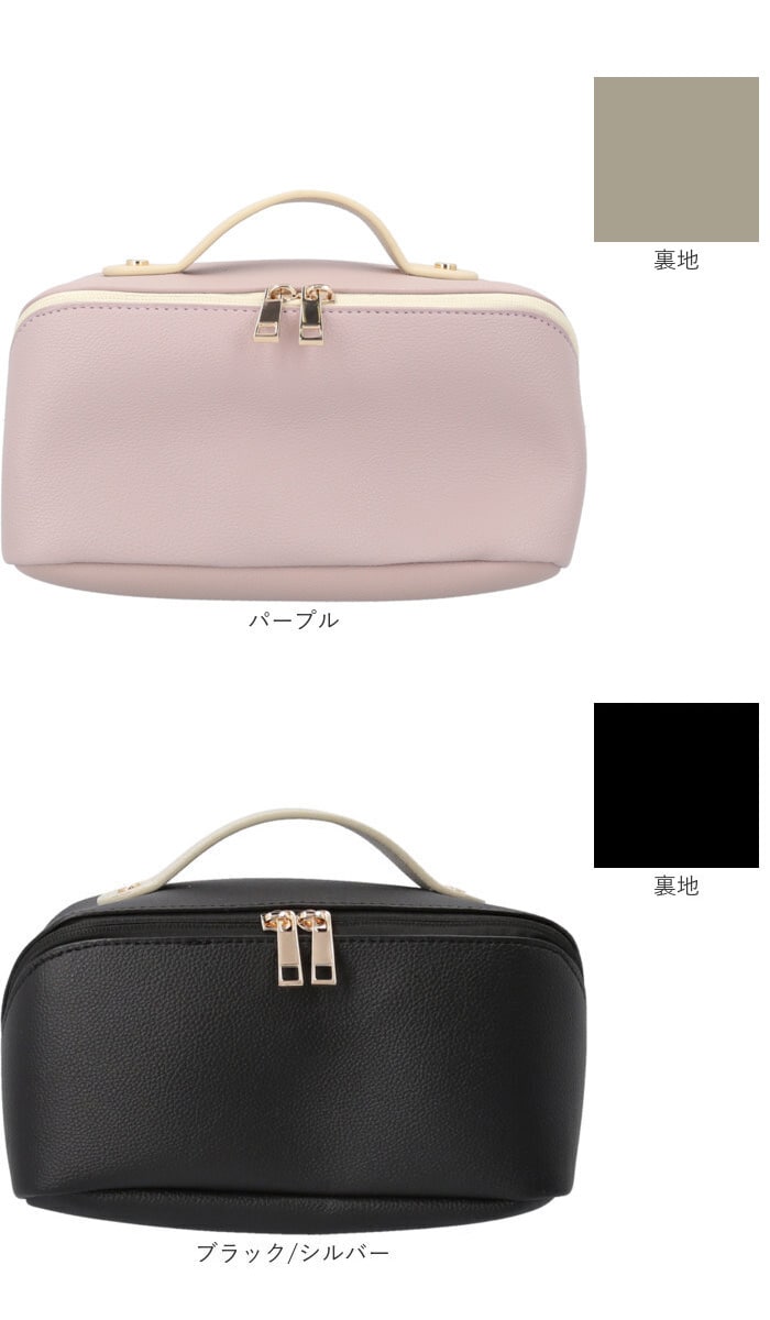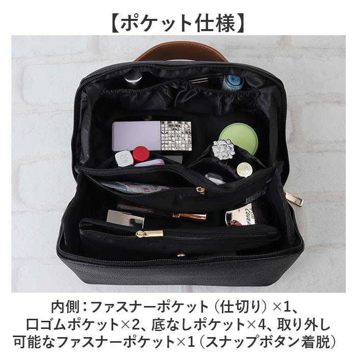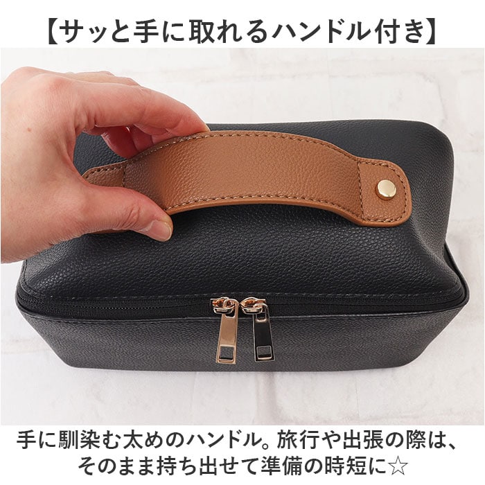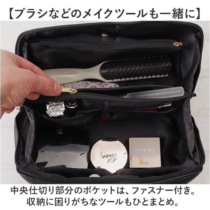 | 商品説明 | 【1軍コスメはこのポーチにお任せ☆】自宅でも持ち運び用にも☆すっきり収納できる「Rename メイクポーチ」。【ガバっと開いて出し入れスムーズ】スクエア型ポーチはファスナーを開くと平らに180度オープン。使いたいアイテムが一目瞭然◎(※)ダブルファスナー式です。【大きめアイテムも収まる大容量設計】ちょこっと大きなパウダーや、コンパクトヘアアイロンもIN。旅行にもとっても便利。【仕切り&ポケットで上手に整理整頓】・2ルーム&底ありポケットに、ホコリが溜まりにくい底なしポケット。定位置を決めやすい♪【ブラシなどのメイクツールも一緒に】中央仕切り部分のポケットは、ファスナー付き。収納に困りがちなツールもひとまとめ。【取り外せる便利な内装ポーチ】汚れたブラシやパフを収納。汚れが気になったら外して手洗いできるから、清潔をキープ。【ごちゃつかない、こだわりの設計】秘密は仕切りの高さ!開口部を閉めた時に、反対側にアイテムが移動するのを軽減。【サッと手に取れるハンドル付き】手に馴染む太めのハンドル。旅行や出張の際は、そのまま持ち出せて準備の時短に☆【落ち着きのある大人な仕上がり】シボ感のあるフェイクレザーに、ゴールド金具がマッチ。年代問わず使いやすい上品な風合い♪【ポケット仕様】内側:ファスナーポケット(仕切り)×1、口ゴムポケット×2、底なしポケット×4、取り外し可能なファスナーポケット×1(スナップボタン着脱) |