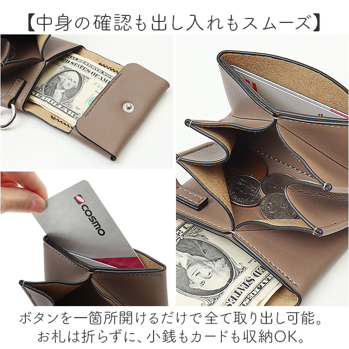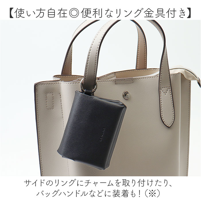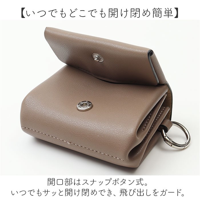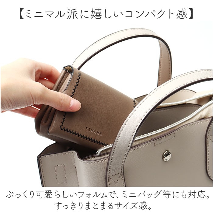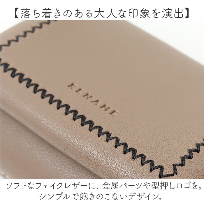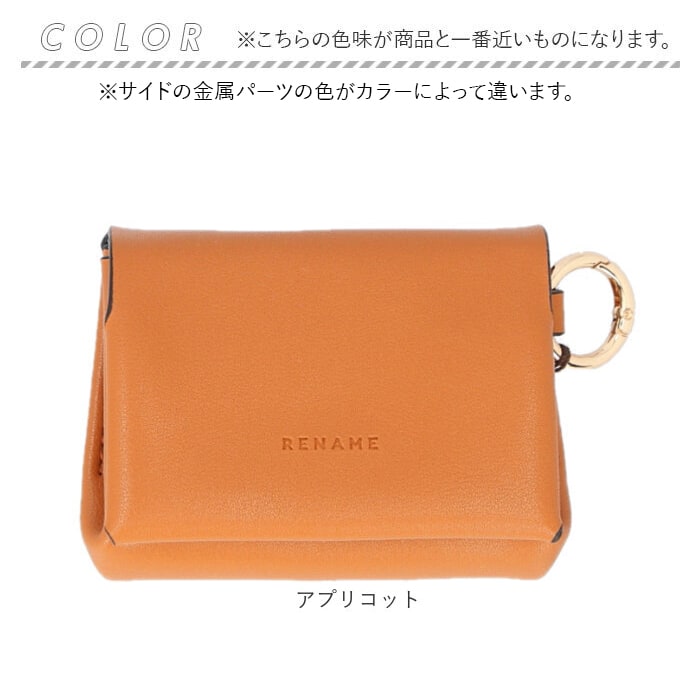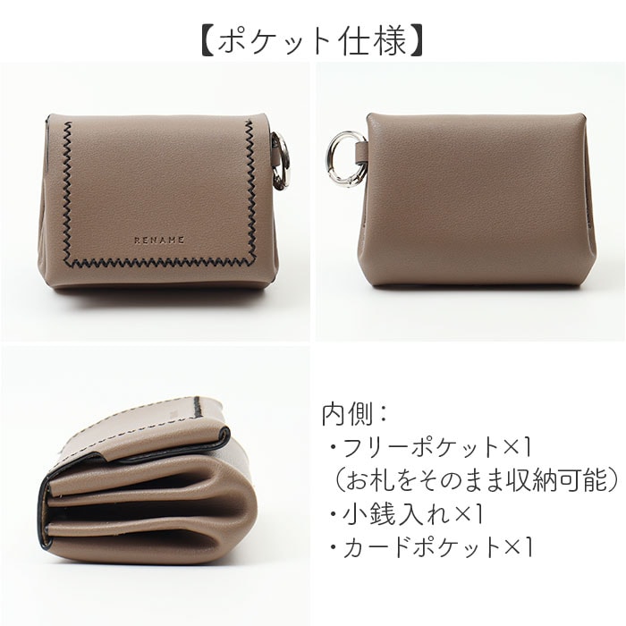 | 商品説明 | 【現金もカードも入る万能アイテム】小さくてもしっかり入って使い勝手抜群。色んなシーンで活躍する「Rename ミニ財布」。【ミニマル派に嬉しいコンパクト感】ぷっくり可愛らしいフォルムで、ミニバッグ等にも対応。すっきりまとまるサイズ感。【いつでもどこでも開け閉め簡単】開口部はスナップボタン式。いつでもサッと開け閉めでき、飛び出しをガード。【中身の確認も出し入れもスムーズ】ボタンを一箇所開けるだけで全て取り出し可能。お札は折らずに、小銭もカードも収納OK。【使い方自在◎便利なリング金具付き】サイドのリングにチャームを取り付けたり、バッグハンドルなどに装着も!(※)金属パーツの色は、お財布のカラーにより異なります。【落ち着きのある大人な印象を演出】ソフトなフェイクレザーに、金属パーツや型押しロゴを。シンプルで飽きのこないデザイン。【大切な方へのギフトにもおすすめ】年代問わず使いやすく、誕生日などの贈り物にも最適。ナチュラルな巾着袋入り♪【ポケット仕様】内側:フリーポケット×1(お札をそのまま収納可能)、小銭入れ×1、カードポケット×1 |