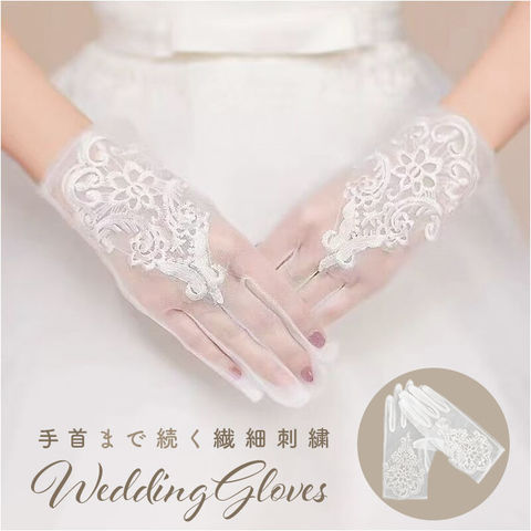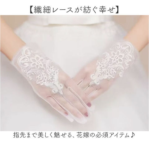| 商品説明 | 【繊細レースが紡ぐ幸せ】指先まで美しく魅せる、花嫁の必須アイテム♪【手首まで続く繊細刺繍】指先から手首まで途切れることなく施された上品な刺繍レースが、花嫁の手元を華やかに彩る一品♪【純白ドレスと完璧調和】真っ白なホワイトカラーが、ウェディングドレスと美しく馴染み、統一感のある洗練されたブライダルスタイルを実現◎ |