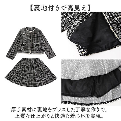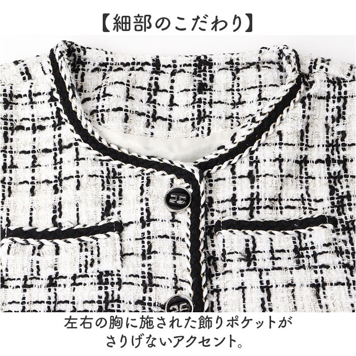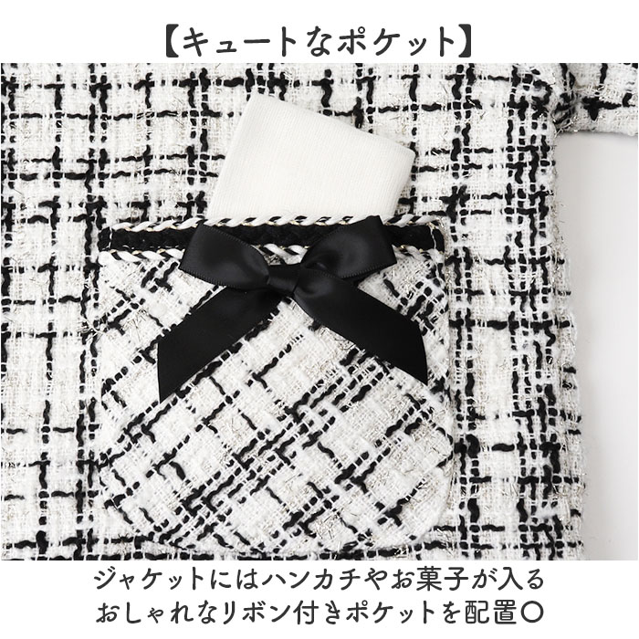 | 商品説明 | 【フォーマルなシーンで大活躍】ツイードデザインが可愛い♪「キッズフォーマル スーツ」が登場!【便利なセットアップ】お手持ちのインナーと合わせるだけであっという間に上品コーデが完成◎【裏地付きで高見え】厚手素材に裏地をプラスした丁寧な作りで、上質な仕上がりと快適な着心地を実現。【高級感のあるデザイン性】ジャケットに施された装飾ボタンが洗練された印象を演出。【細部のこだわり】左右の胸に施された飾りポケットがさりげないアクセント。【キュートなポケット】ジャケットにはハンカチやお菓子が入るおしゃれなリボン付きポケットを配置〇【楽ちんゴムウエスト】スカートのウエストはゴム仕様だから、着替えやすくお腹が苦しくなりにくい。 |